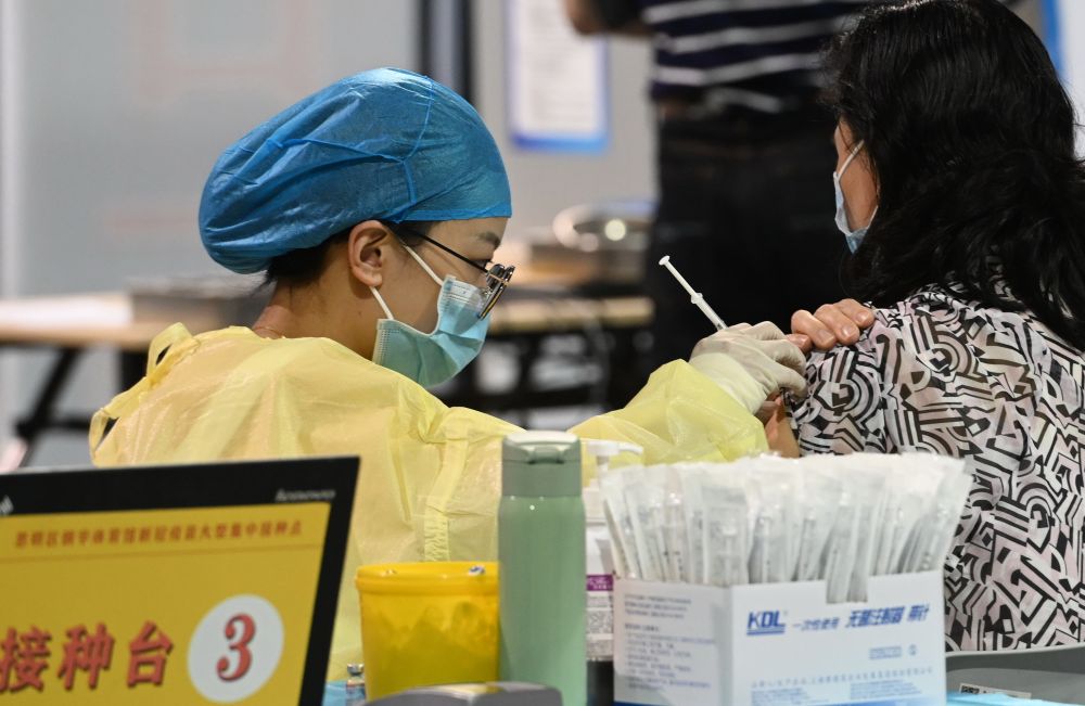 3月15日,医务人员在厦门一处疫苗接种点为市民接种疫苗。新华社记者 林善传 摄