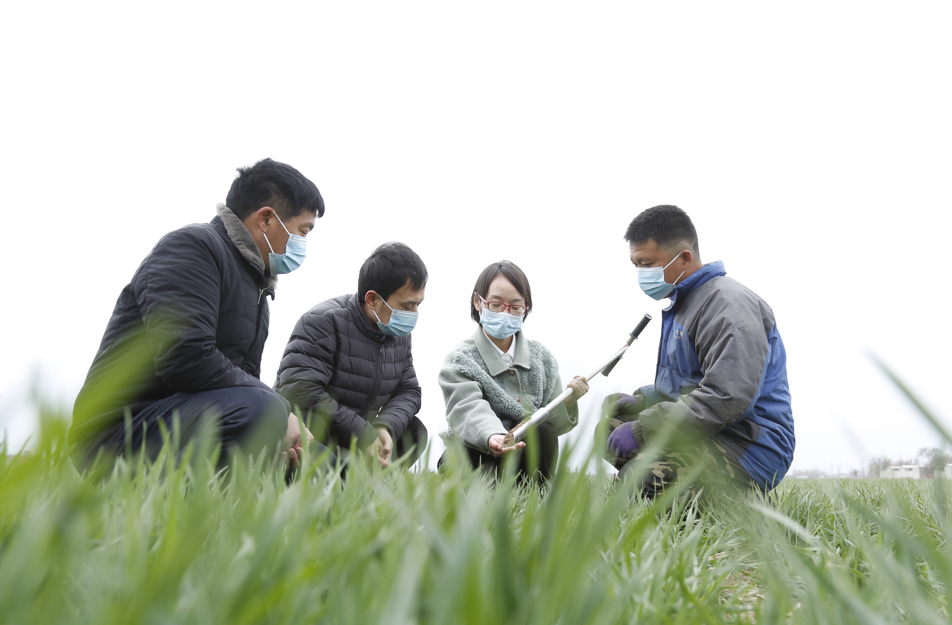 新华社照片,北京,2022年3月19日 打好夏粮丰收仗——我国全力以赴保障粮食生产 在河北省邢台市南和区贾宋镇宁营村,气象局工作人员和农民在麦田查看土壤墒情(3月17日摄)。 (配本社同题文字稿) 新华社发(张驰 摄)