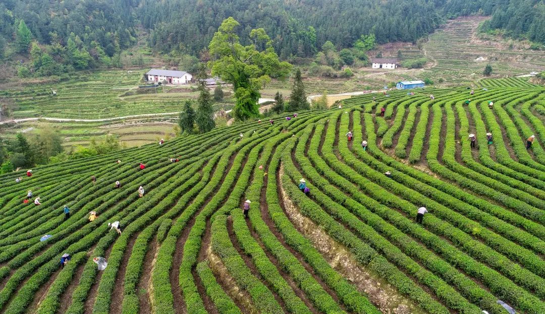江西省万安县弹前乡大岩村茶叶基地,茶农正在采摘春茶,一片忙碌景象。邱哲 摄