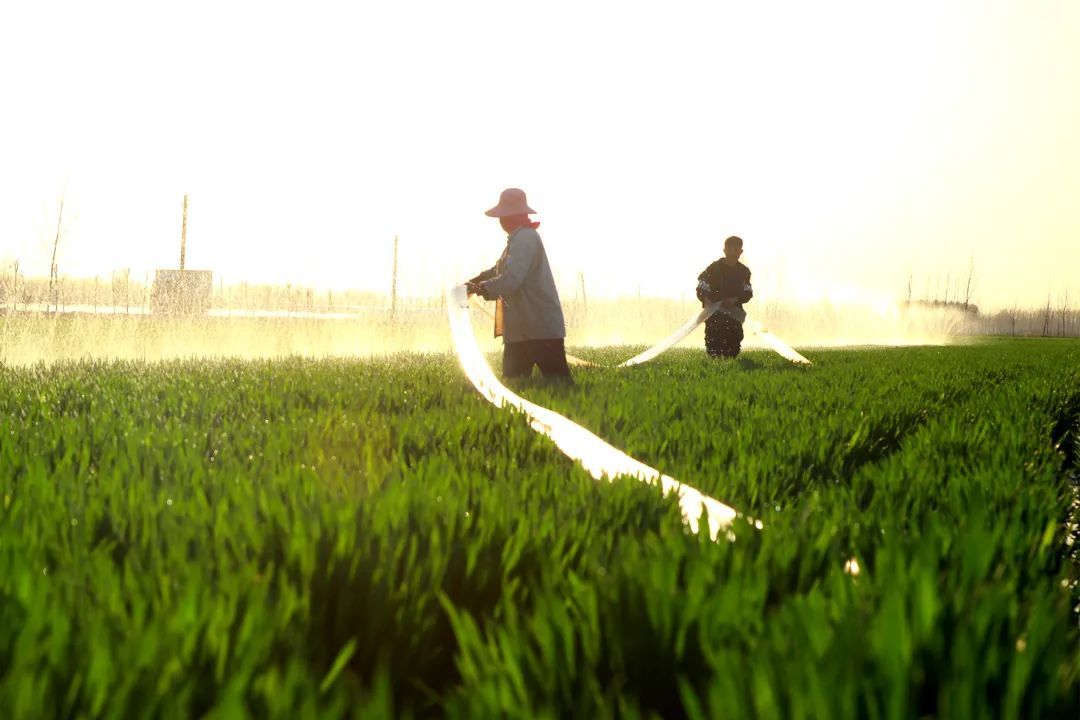 春分时节,河南省开封市尉氏县邢庄乡烧酒湖村的村民在麦田地里给小麦苗浇灌返青水。李新义 摄