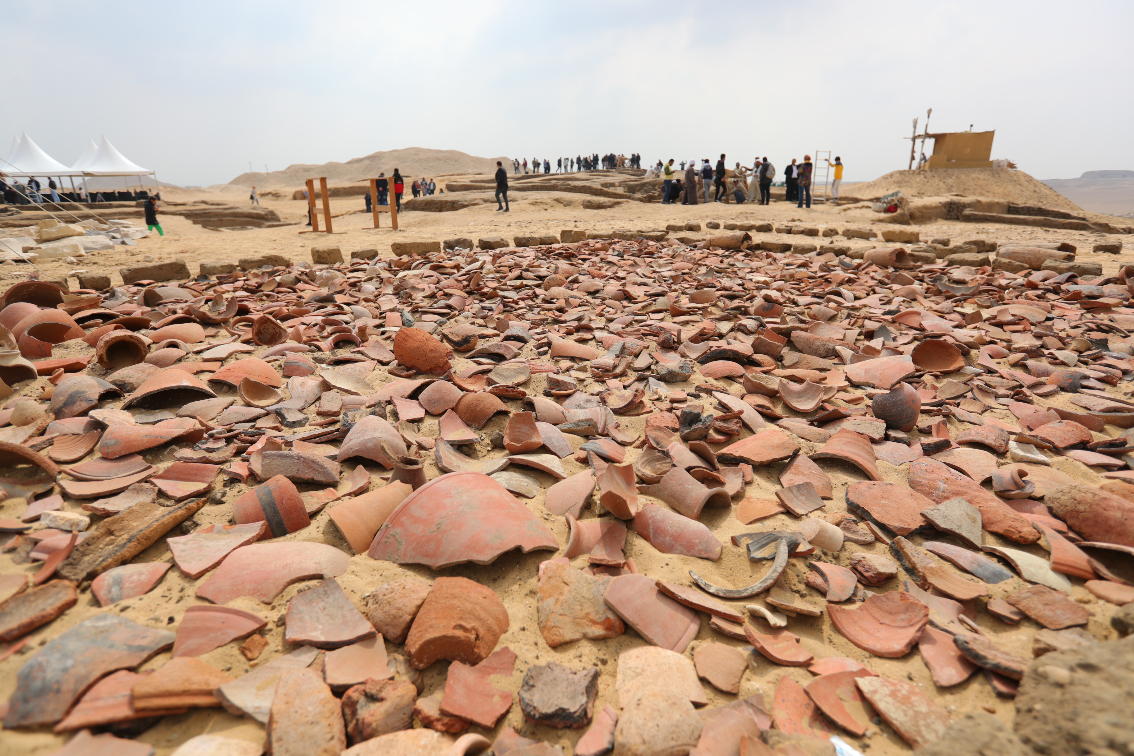 新华社照片,开罗,2022年3月20日 (国际)(6)埃及塞加拉新发现5座距今4000余年的墓葬 这是3月19日在埃及首都开罗以南的塞加拉地区拍摄的出土陶片。 埃及旅游和文物部19日在首都开罗以南约30公里的塞加拉古墓群发掘现场宣布,埃及考古队在此地新发现5座距今4000余年的墓葬,保存情况良好。 新华社记者 隋先凯 摄