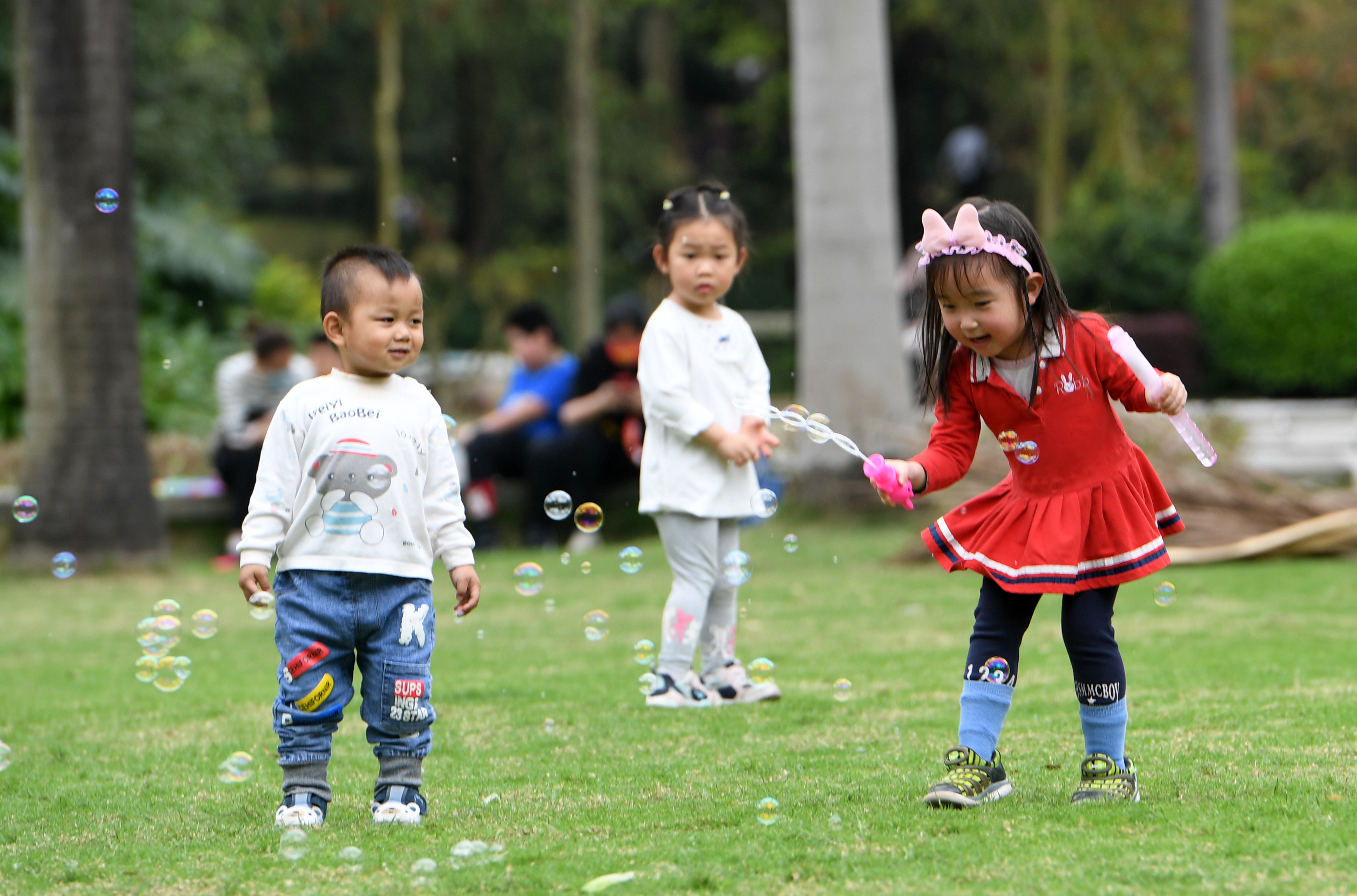 新华社照片,南宁,2022年3月20日 乐享春光 3月20日,小朋友在广西南宁市金花茶公园玩耍。 春分时节,人们在温暖和煦的春风中踏青、赏花,乐享春日美景。 新华社记者 陆波岸 摄