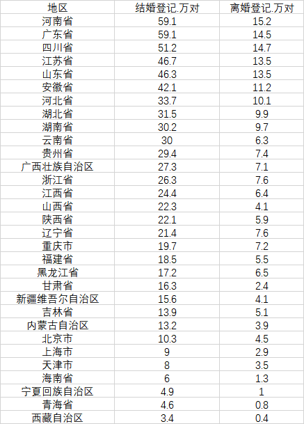 分省份来看,有10个省份结婚人数达到或超过30万对,分别是河南、广东、四川、江苏、山东、安徽、河北、湖北、湖南、云南,其中河南、广东和四川均超过50万对,广东和河南均为59.1万对,并列第一。