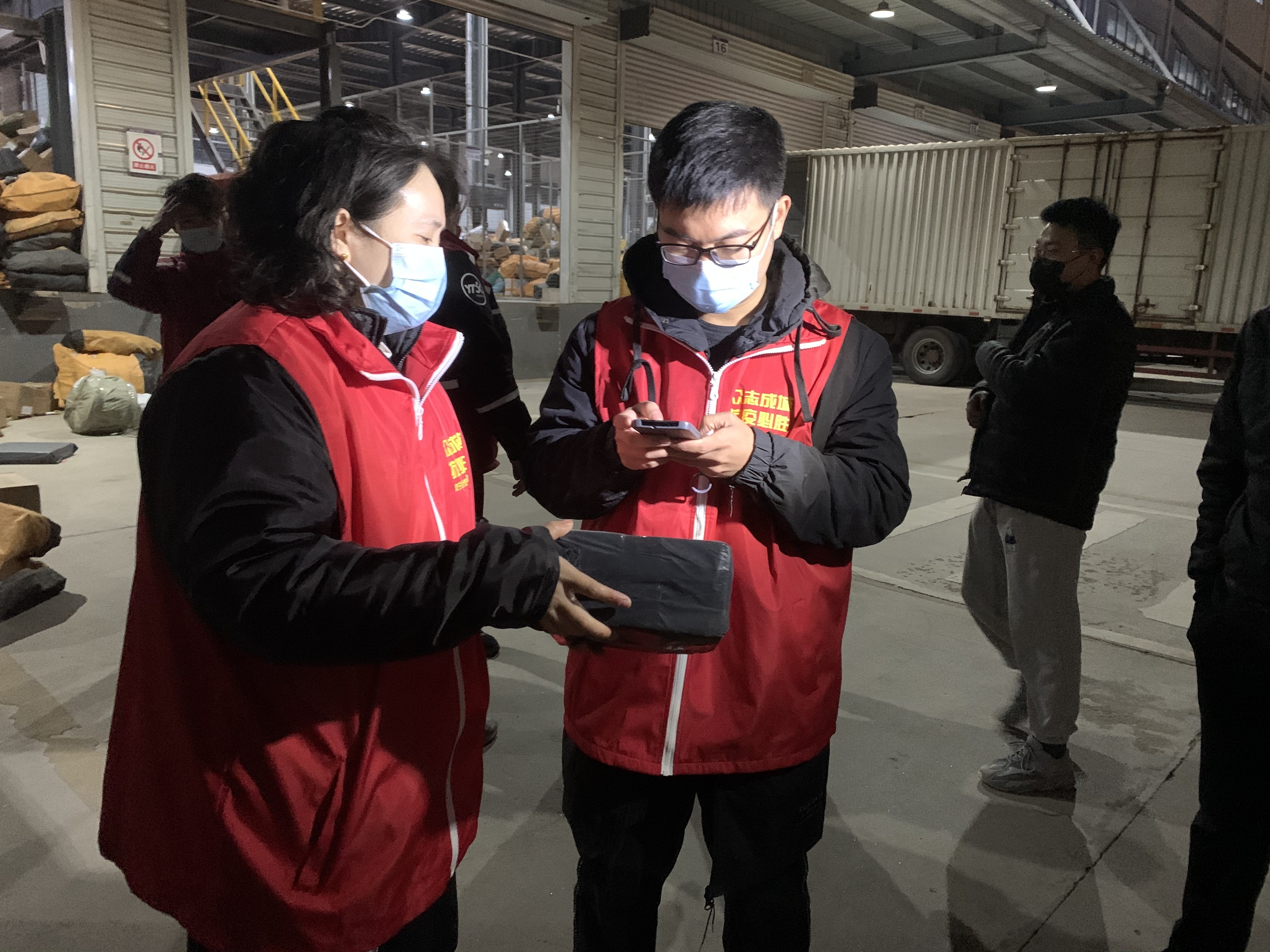 找到药品快递后,肃宁县物流产业聚集区工作人员马盼盼和田海,拍照与王先生核实快件信息。
