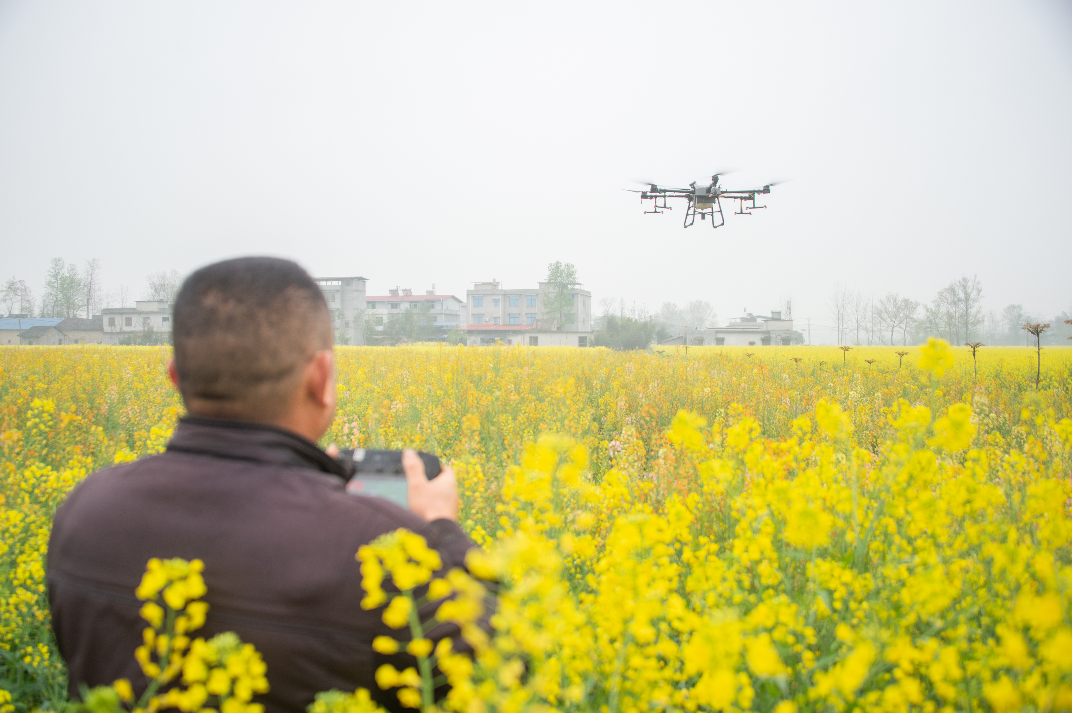 新华社照片,咸宁(湖北),2022年3月20日 春色最浓在田间 3月20日,在湖北省崇阳县青山镇的为民农机专业合作社,农民在田间操控无人机作业。 当日是二十四节气中的春分,各地农民抢抓农时开展农事活动,田间地头一派繁忙景象。 新华社发(伍志尊摄)