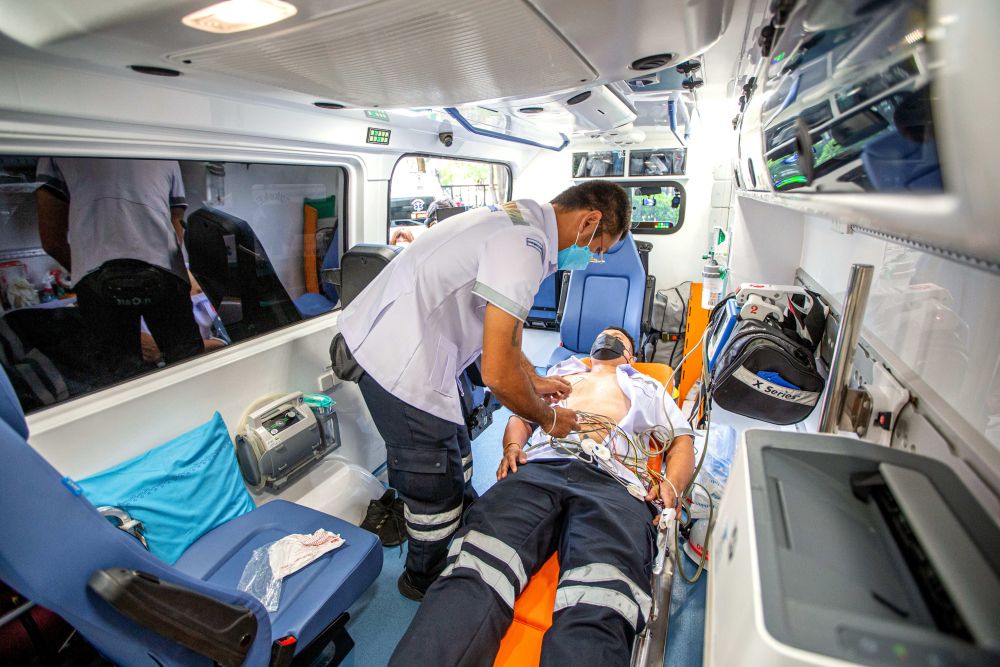 2022年2月14日,在泰国曼谷诗里拉吉医院,医护人员在配备5G技术的救护车中演示救治患者。(新华社记者王腾摄)