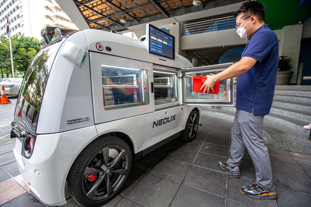 2022年2月14日,在泰国曼谷诗里拉吉医院,一名工作人员将药箱放入5G无人医药车。(新华社记者王腾摄)