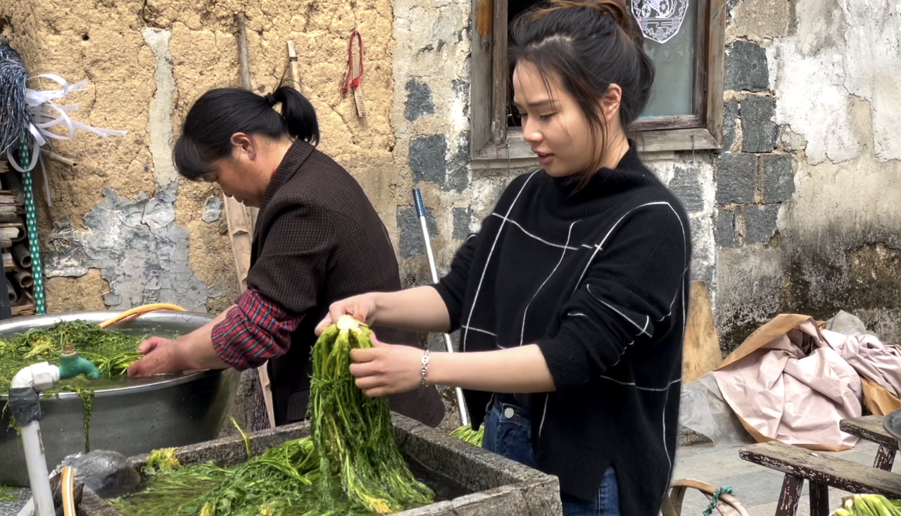 “戴家山8号”民宿主人邵婕和村民一起择菜。新华社记者 段菁菁摄