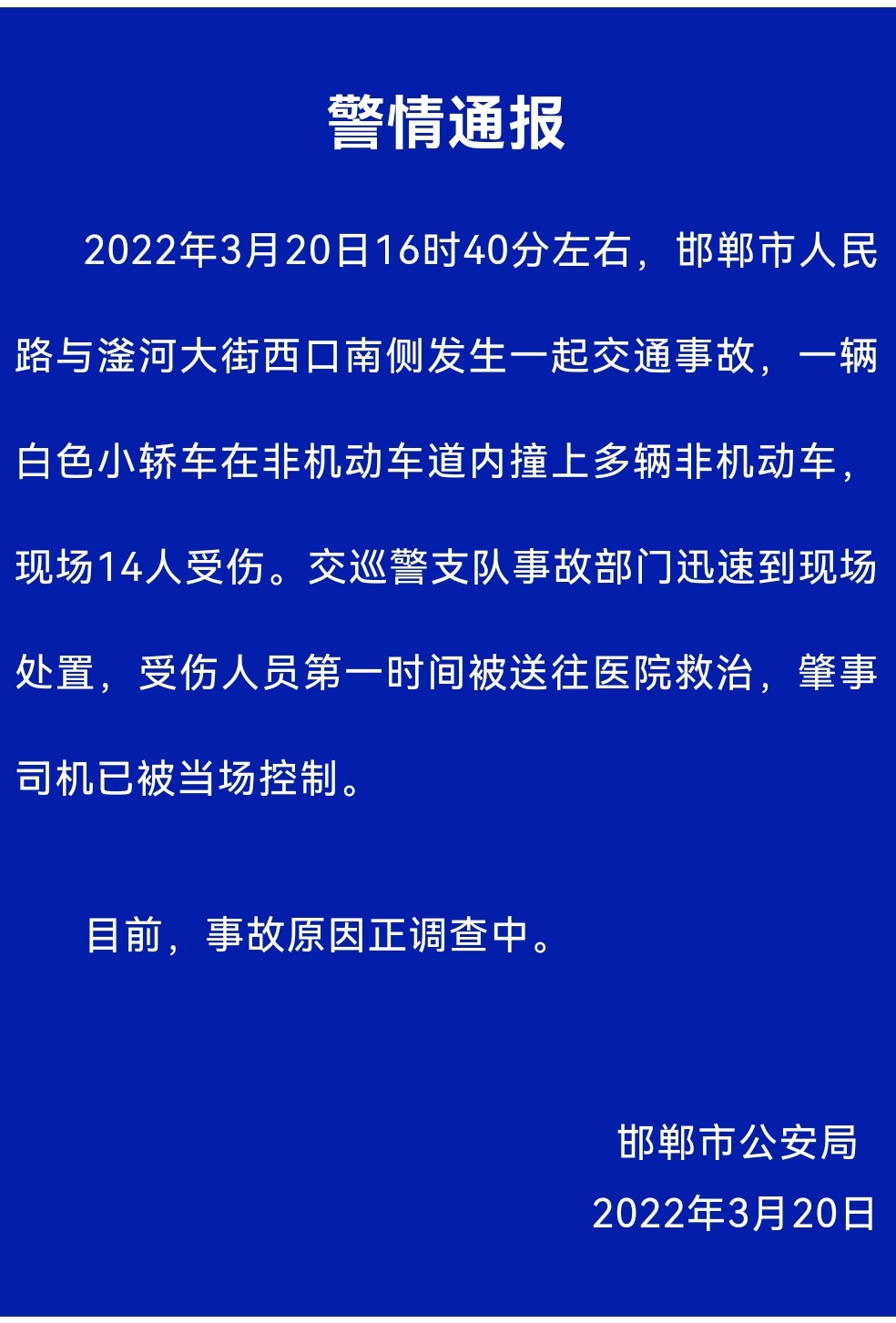 央视网消息(记者 徐辉):3月20日19时37分,河北省邯郸市公安局官方微信公众号“平安邯郸”发布“警情通报”。2022年3月20日16时40分左右,邯郸市人民路与滏河大街西口南侧发生一起交通事故,一辆白色小轿车在非机动车道内撞上多辆非机动车,现场14人受伤。交巡警支队事故部门迅速到现场处置,受伤人员第一时间被送往医院救治,肇事司机已被当场控制。