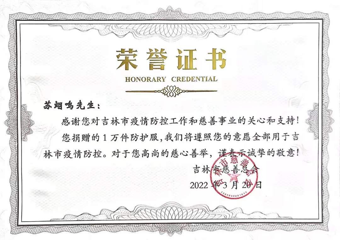 近日,冬奥冠军苏翊鸣向吉林市捐赠了1万套防护服,并在箱子上留言:“吉林加油!医护人员辛苦了!”吉林市慈善总会在20日为苏翊鸣颁发荣誉证书,并将按照苏翊鸣的意愿,将所有防护服用于疫情防控。