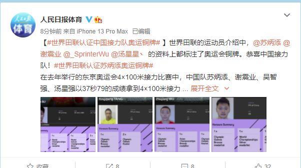 国际田联的运动员介绍中,苏炳添、谢震业、吴智强、汤星强等资料上都标注了奥运会铜牌。恭喜中国接力队!