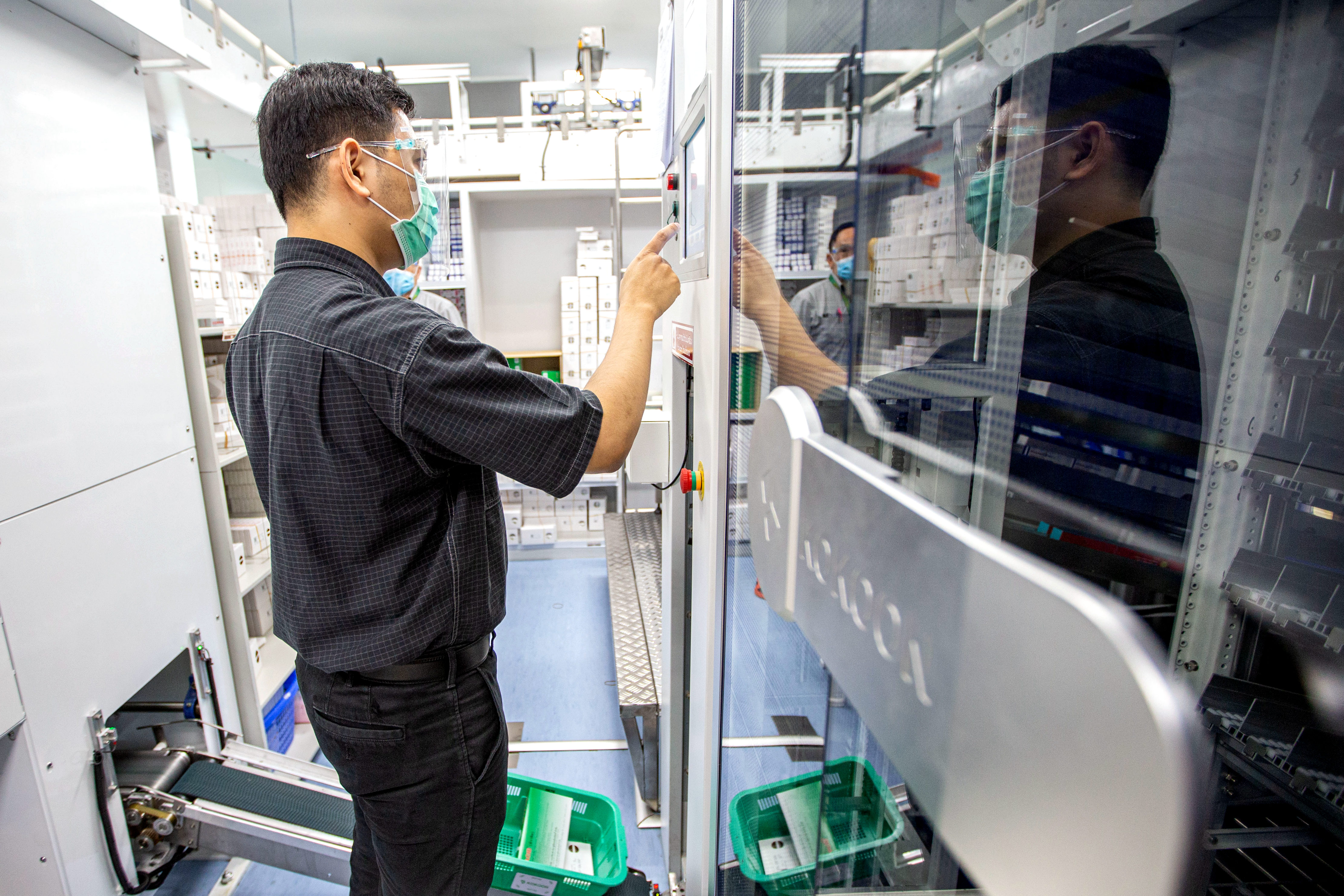 新华社照片,曼谷,2022年3月21日 (国际·图文互动)(2)通讯:泰国5G智慧医院里的中国智慧 2月14日,在泰国曼谷诗里拉吉医院,工作人员操作5G药品分配器。 (配本社同题文字稿) 新华社记者 王腾 摄