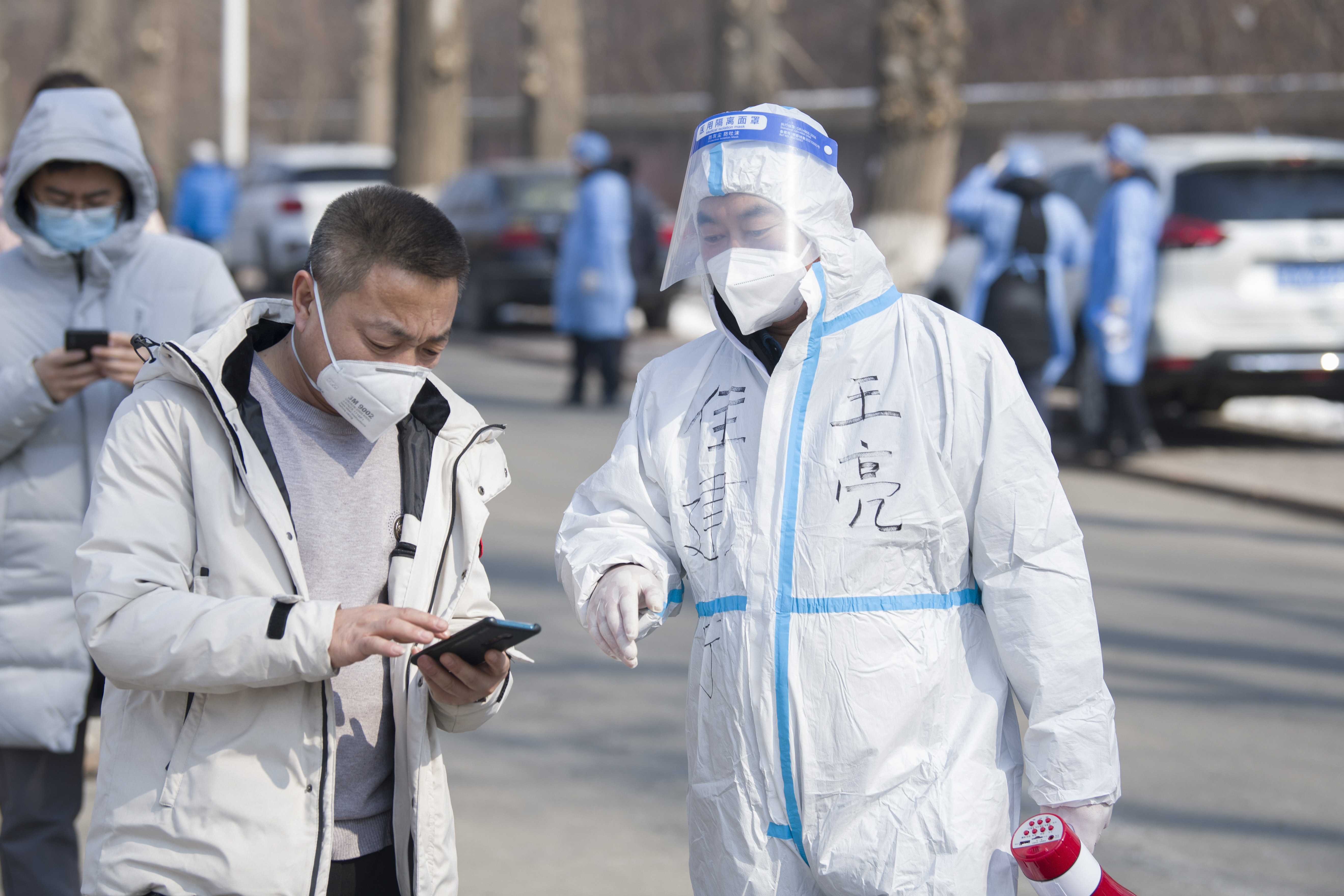 新华社照片,长春,2022年3月21日 长春开展全员核酸检测 3月21日,防疫志愿者帮助接受核酸采样的居民进行信息登记。 当日,长春市三天全员核酸检测进入第二天。为以最快速度实现社会面清零,早日恢复正常生产生活秩序,长春市已对所有小区(村)和社会面实行提级管控,并于20日起开启三天全员核酸检测。 新华社发(张扬摄)