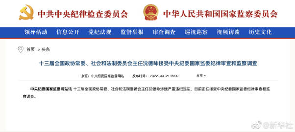 【十三届全国政协常委、社会和法制委员会主任#沈德咏接受中央纪委国家监委纪律审查和监察调查#】