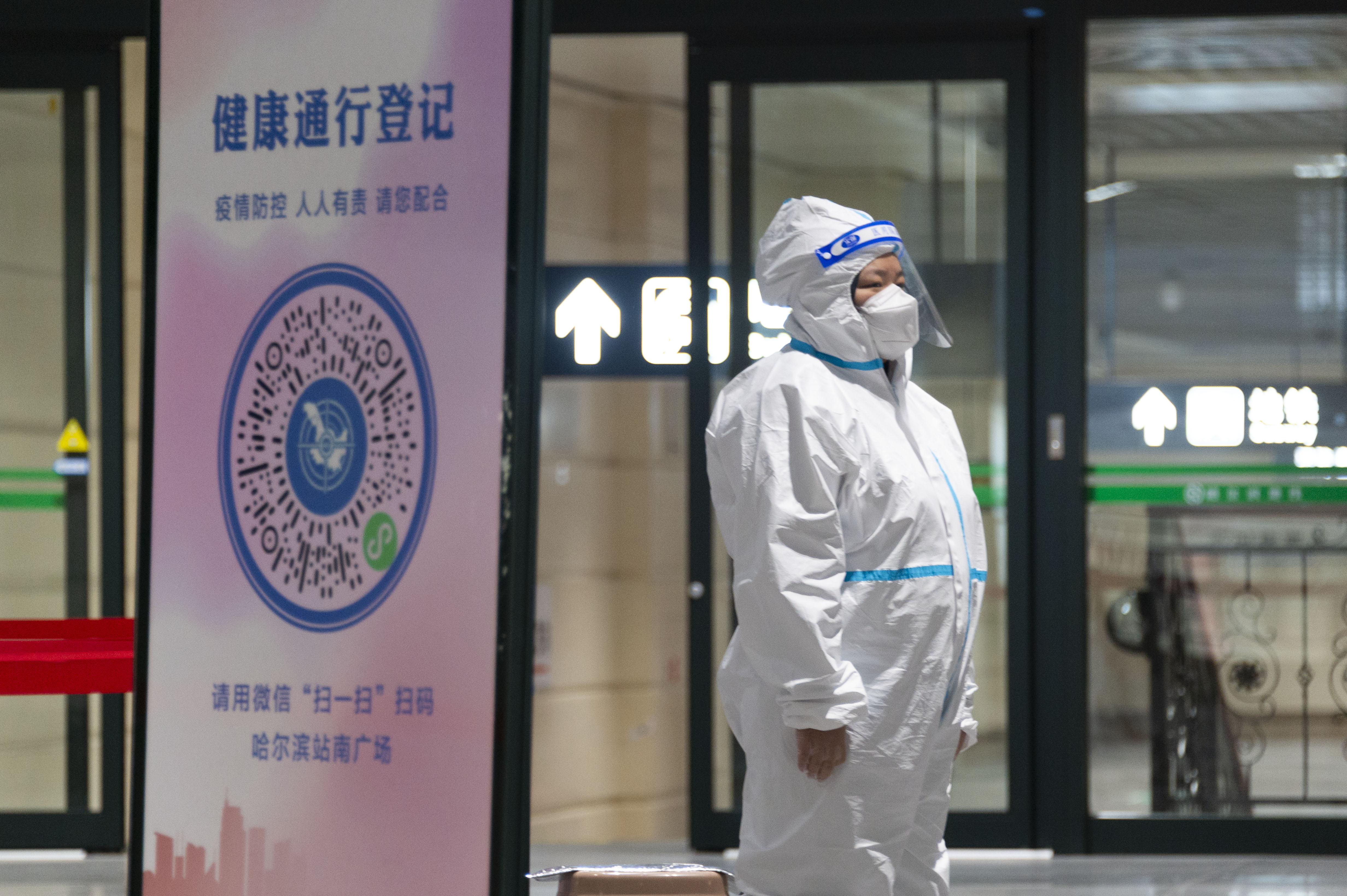 新华社照片,哈尔滨,2022年3月21日 致敬!坚守在疫情防控一线的你们 3月21日,工作人员在哈尔滨站南广场进站口值守。 为应对当前新冠肺炎疫情,黑龙江省哈尔滨市的医务人员、志愿者、党员干部等防疫工作者坚守在疫情防控一线。他们岗位不同、年龄不一,却有着共同的目标——防止疫情传播,保障市民健康。 新华社记者 谢剑飞 摄