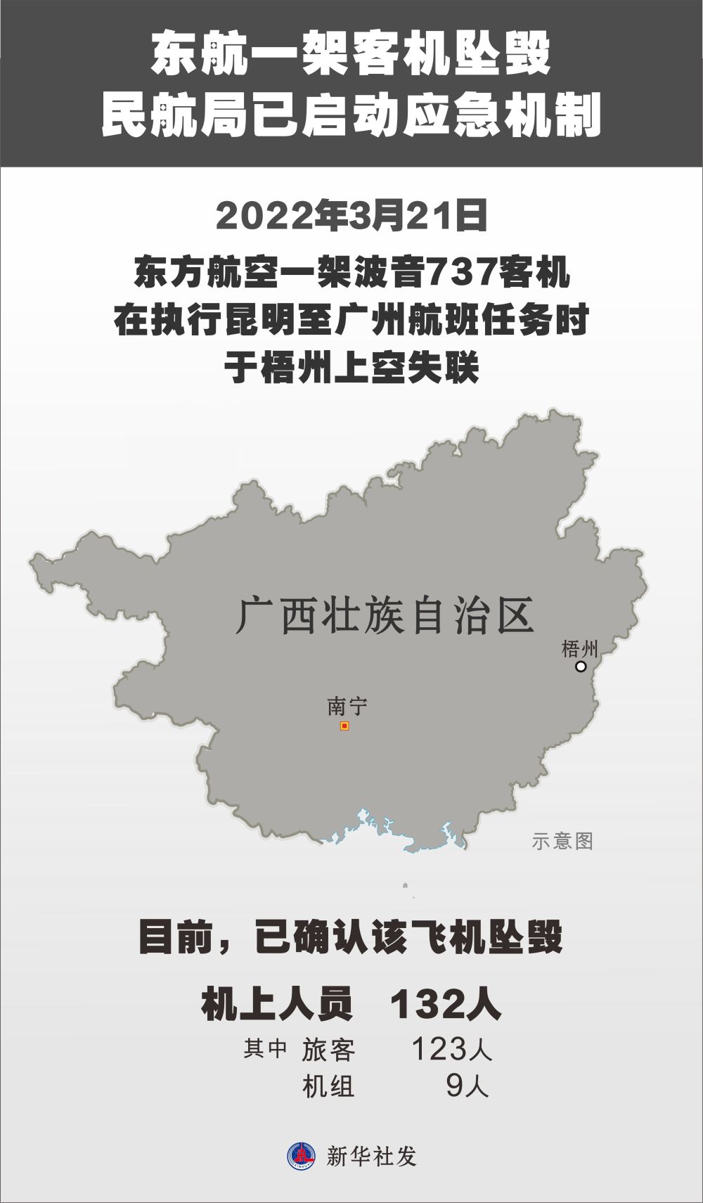 记者3月21日从民航局获悉,2022年3月21日,东方航空一架波音737客机在执行昆明至广州航班任务时,于梧州上空失联。目前,已确认该飞机坠毁。机上人员共132人,其中旅客123人、机组9人。
