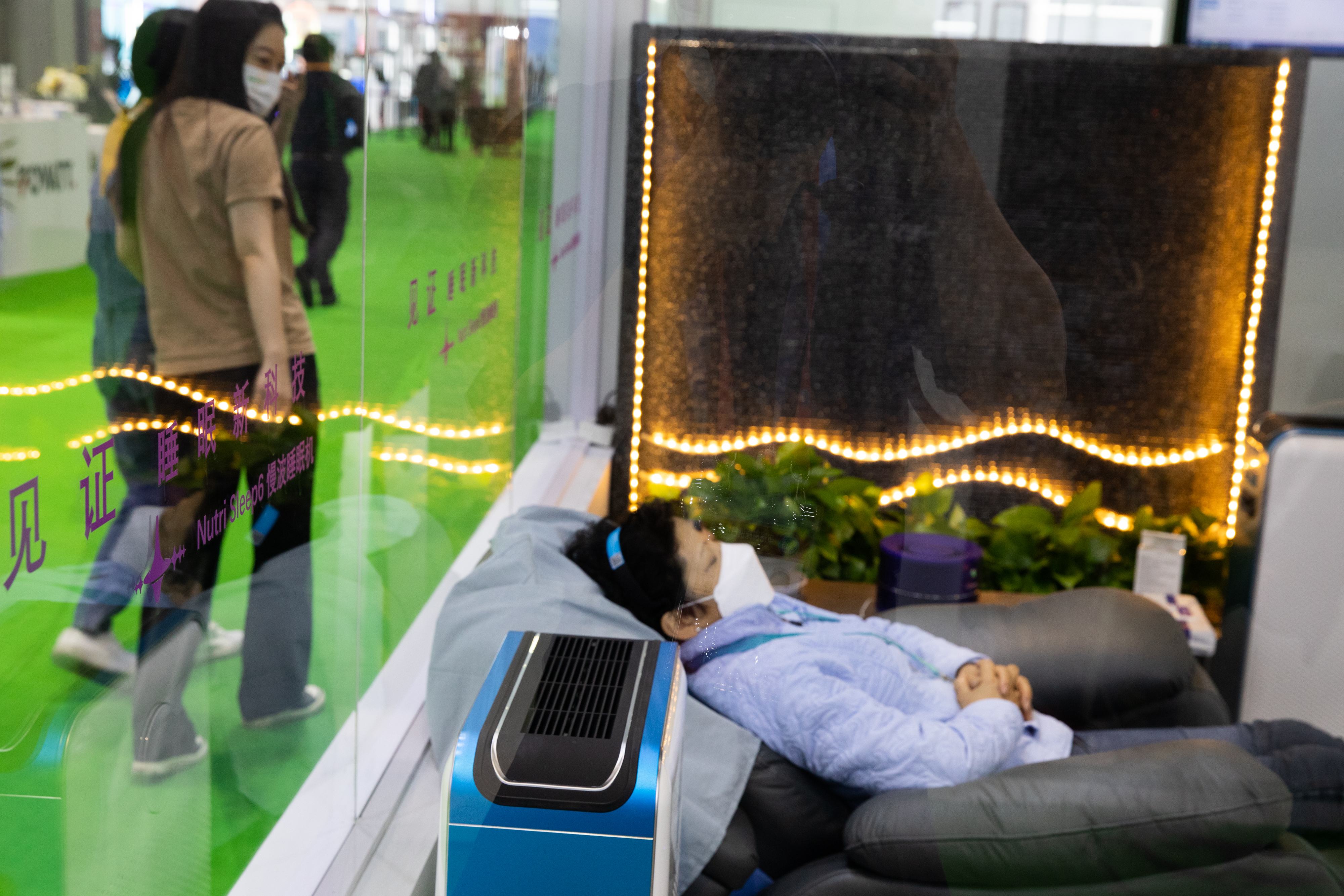 2021年11月5日,参观者在第四届进博会医疗器械及医药保健展区体验睡眠科技产品。新华社记者 金立旺 摄