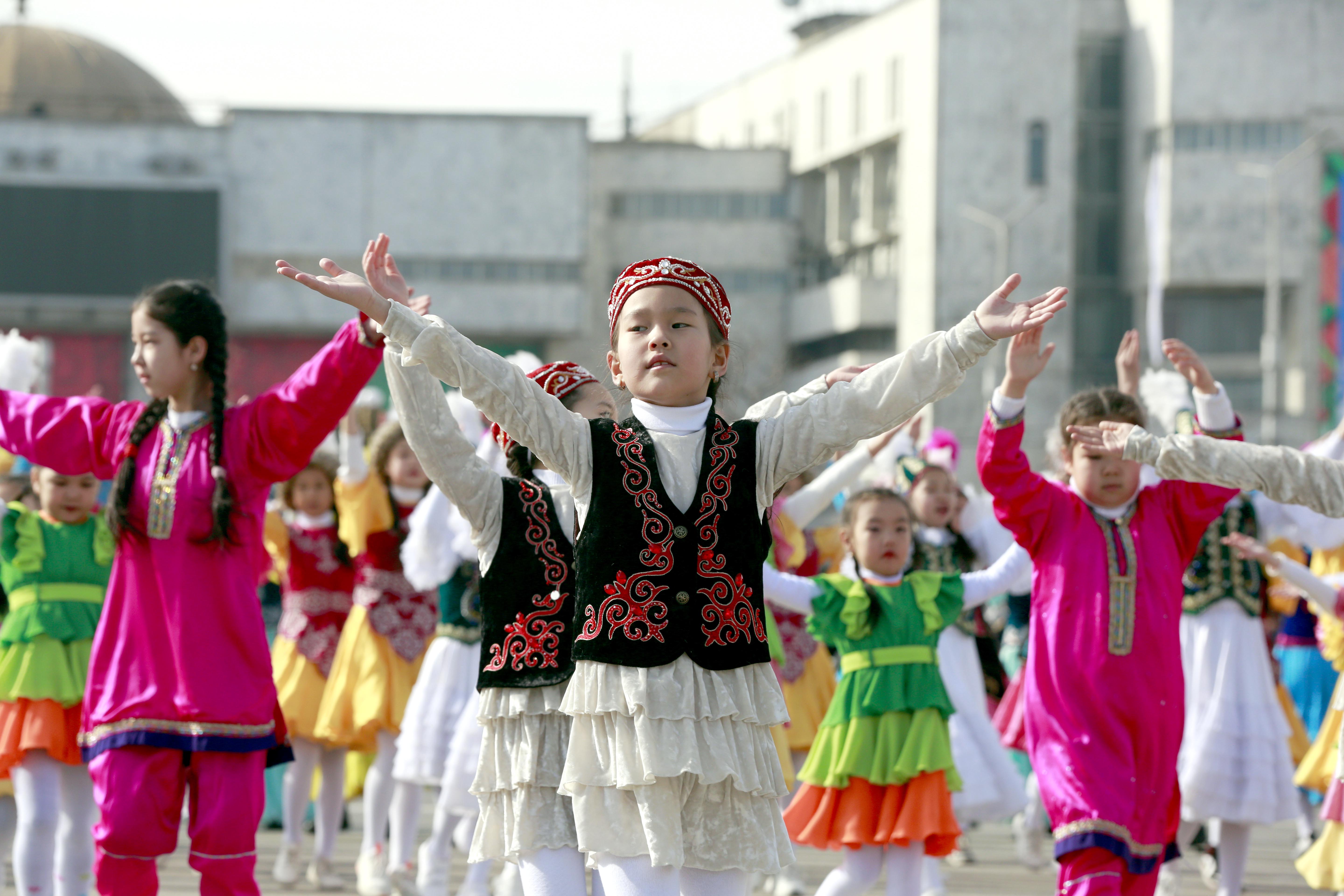 新华社照片,比什凯克,2022年3月21日 (国际)(2)吉尔吉斯斯坦庆祝纳乌鲁斯节 3月21日,孩子们在吉尔吉斯斯坦首都比什凯克阿拉套广场举行的纳乌鲁斯节庆典上表演舞蹈。 纳乌鲁斯节是中亚国家最重要的传统节日之一,标志着春天的到来和新的一年开始。2009年,纳乌鲁斯节被列入联合国教科文组织非物质文化遗产。 新华社发(罗曼摄)