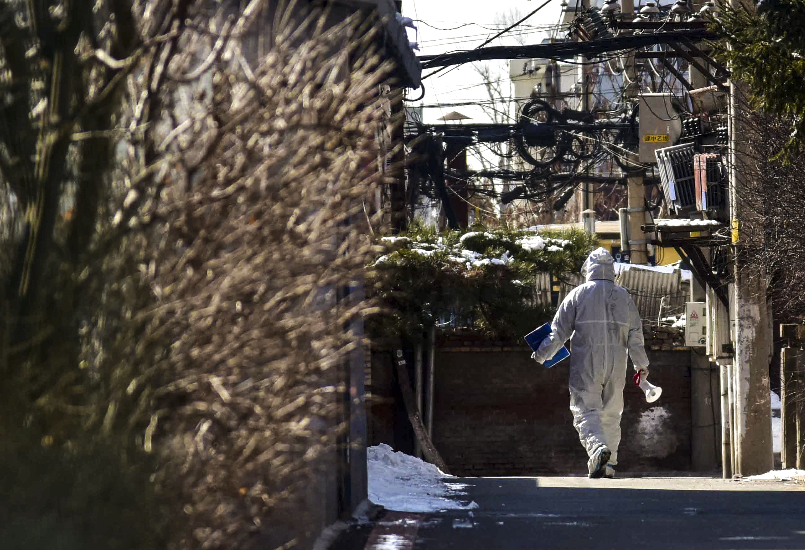 3月20日,在长春市一处居民区,疫情防控工作人员用扩音器通知楼内居民下楼接受核酸检测。新华社记者 周长庆 摄