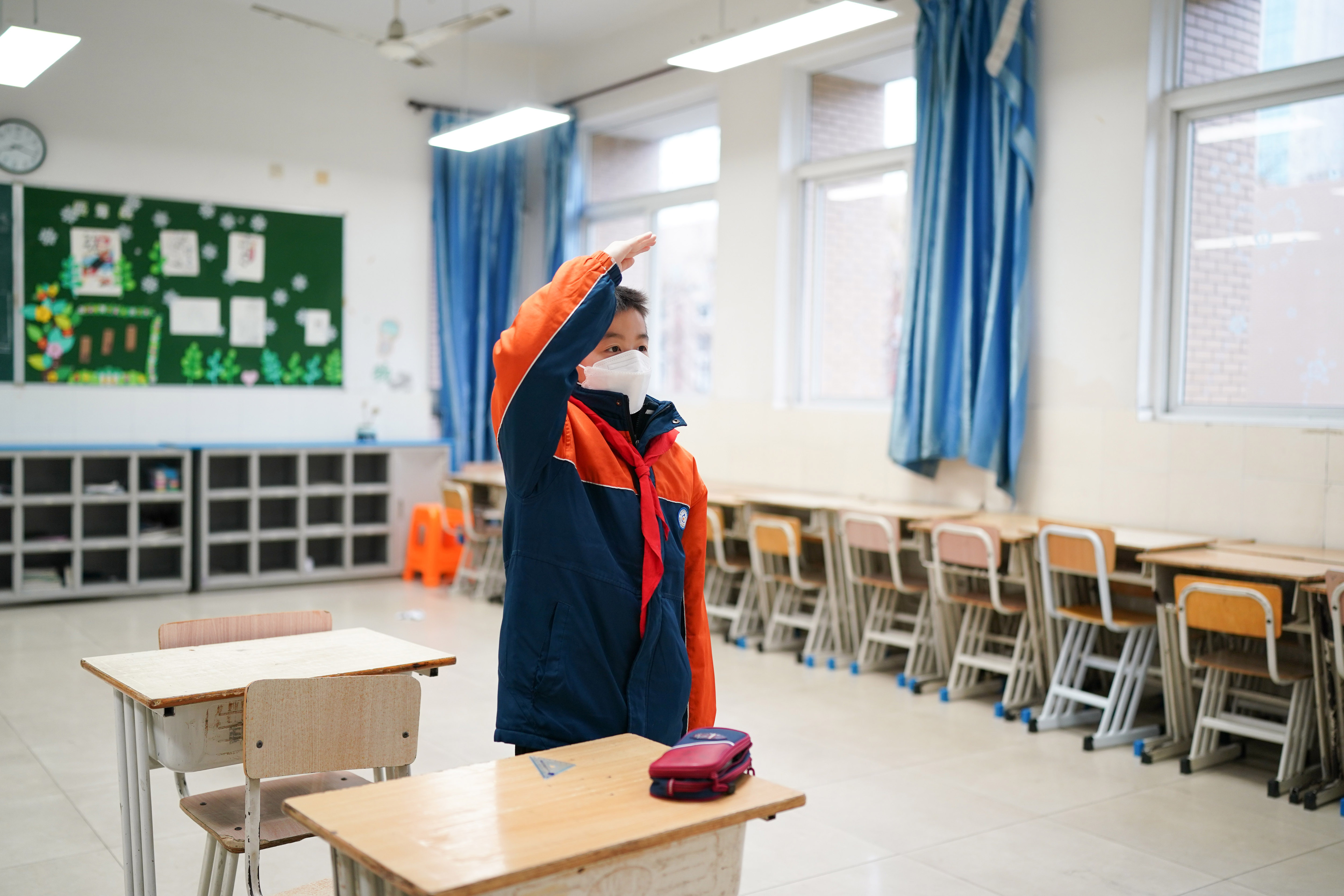 新华社照片,上海,2022年3月21日 一个人的课堂 3月21日,在“空中课堂”的升旗仪式上,蒲芸帆在教室内敬礼。 当日,上海市杨泰实验学校四年级六班的蒲芸帆照常从学校宿舍醒来,用完早餐,走进教室开始一天的学习生活。与以往不同的是,教室里只有他一名学生。由于留校住宿等原因,蒲芸帆成了班级里唯一需要在校参与线上学习的学生。据了解,杨泰实验学校共有十多名学生因各种原因需要留校参与线上学习。学校了解情况后第一时间制定了方案,在遵守防疫政策、严格落实疫情防控措施的前提下,安排居家照护存在困难的学生到校参加线上教学。 据悉,上海市中小学已于3月12日起,全部调整为线上教学。同时,上海市教委推出人性化的补充举措:居家照护有困难的中小学生,可申请到校,由学校安排教师组织学生在线上网课,并提供看护服务和午餐。 新华社记者 丁汀 摄
