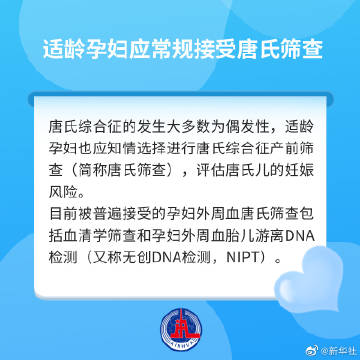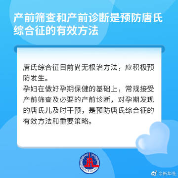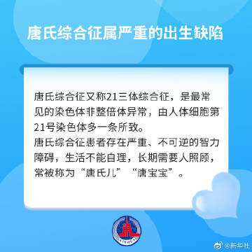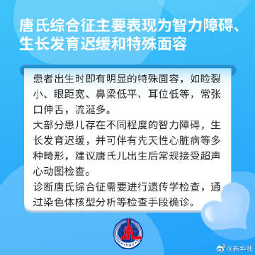 【关于唐氏综合征的这些知识不可不知】#3月21日是世界唐氏综合征日#。唐氏综合征患者存在严重、不可逆的智力障碍,目前这一疾病尚无根治方法。#唐氏综合征是什么#?如何预防?21日,国家卫健委发布唐氏综合征防治健康教育核心信息。戳图了解其中重点↓(记者田晓航、沐铁城)