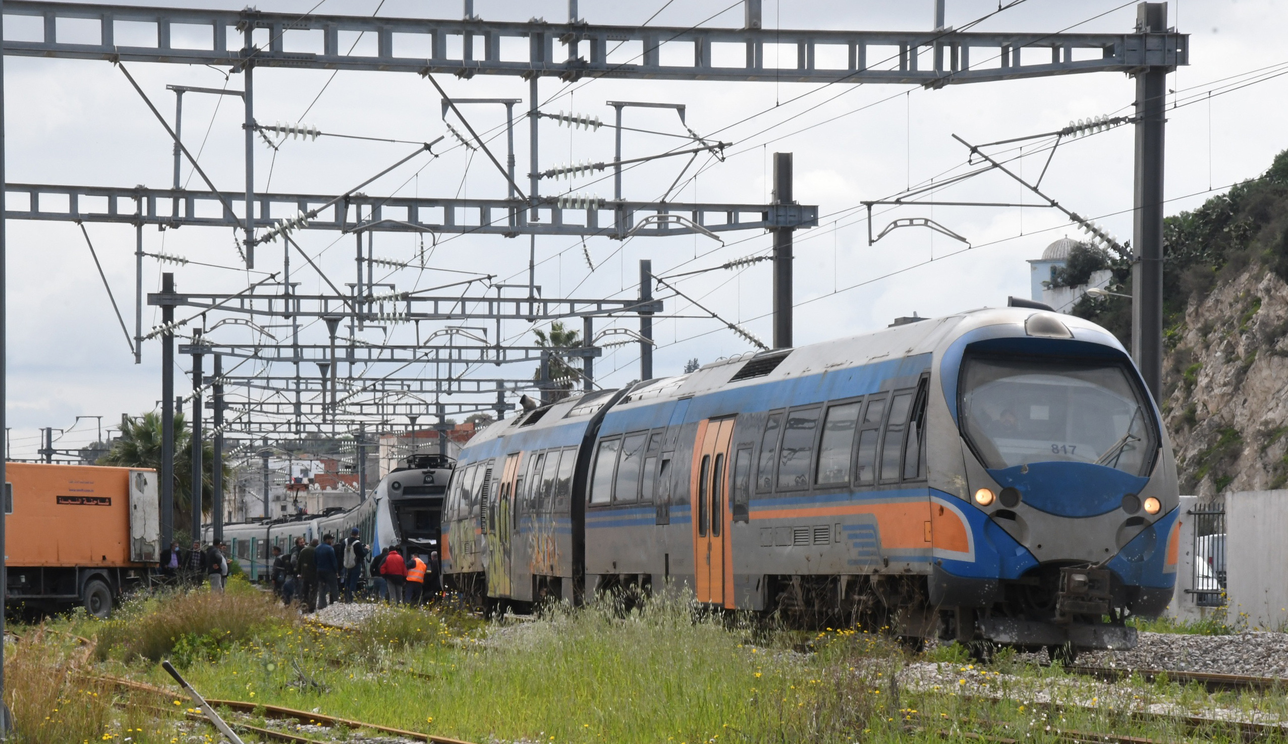 新华社照片,突尼斯市,2022年3月21日 (国际)(3)突尼斯两列列车相撞造成90多人受伤 3月21日,工作人员在突尼斯首都突尼斯市的事故现场查看。 突尼斯首都突尼斯市南郊21日早晨发生两列列车相撞事故,造成90多人受伤。 新华社发(阿代尔摄)