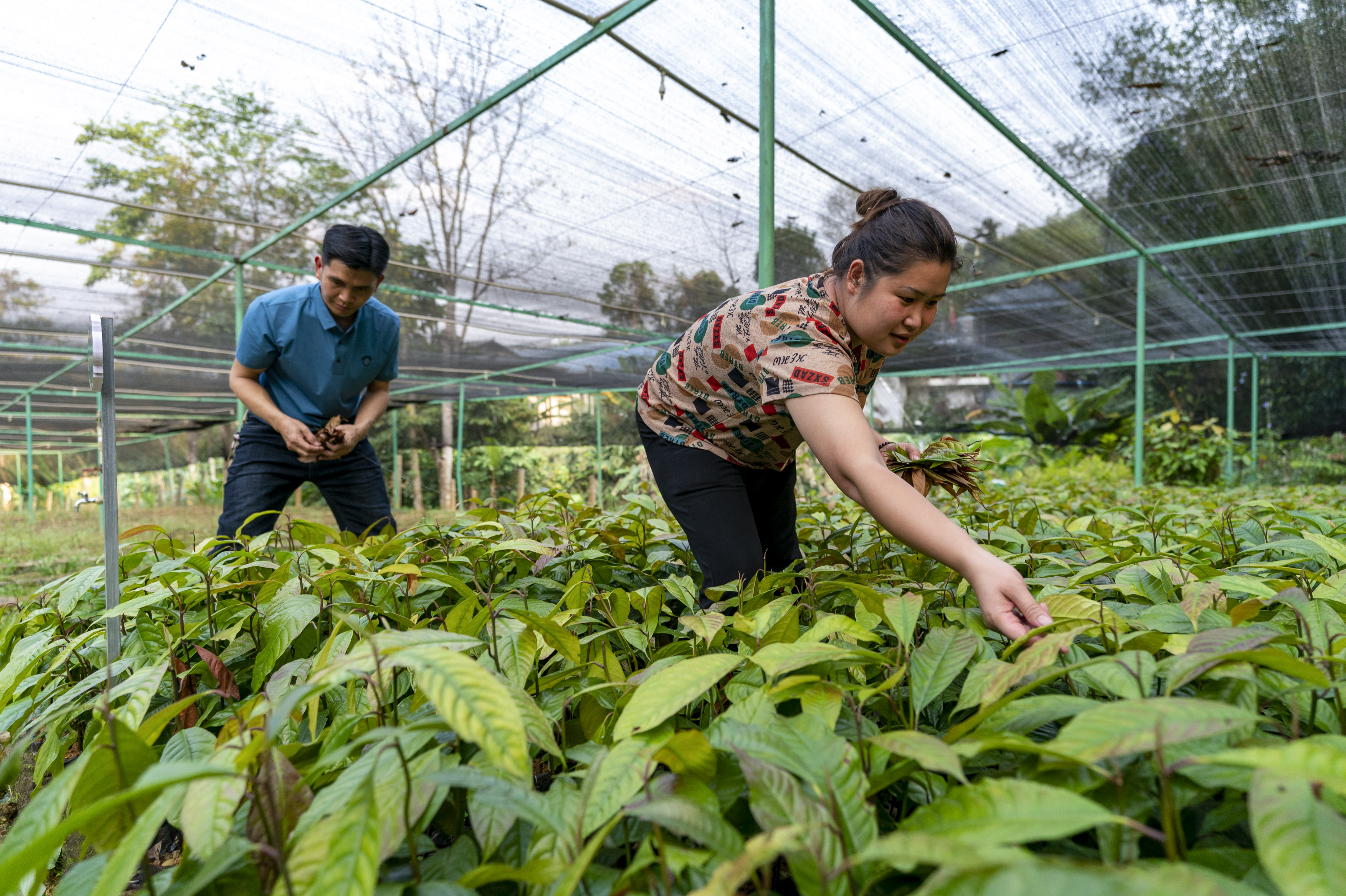 新华社照片,昆明,2022年3月21日 擦亮“北回归沙漠带上的绿宝石” 工作人员在纳板河流域国家级自然保护区自然教育基地野外工作站培育区为植株幼苗除枯叶(3月16日摄)。 (配本社同题文字稿) 新华社记者 陈欣波 摄