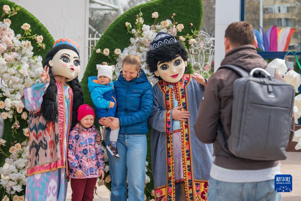 3月20日,在乌兹别克斯坦首都塔什干一处公园庆祝纳乌鲁斯节的活动上,人们合影留念。