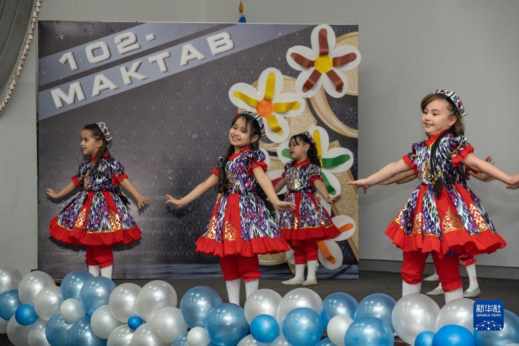 3月19日,在乌兹别克斯坦首都塔什干一个学校庆祝纳乌鲁斯节的活动上,孩子们身着传统民族服饰表演。