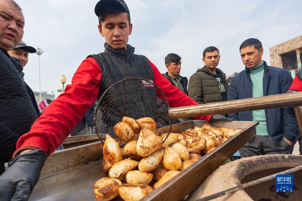 3月20日,在乌兹别克斯坦首都塔什干一处公园庆祝纳乌鲁斯节的活动上,人们等候购买传统美食。