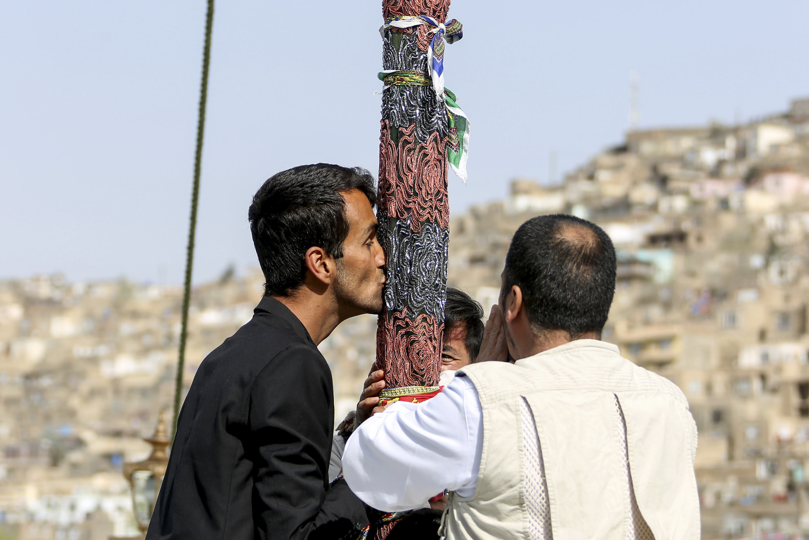 新华社照片,喀布尔,2022年3月22日 (国际)(2)阿富汗民众迎来诺鲁孜节 3月21日,人们在阿富汗喀布尔的诺鲁孜节庆祝活动上亲吻一根柱子。 阿富汗民众21日迎来诺鲁孜节。 新华社发(塞夫拉赫曼·萨菲摄)