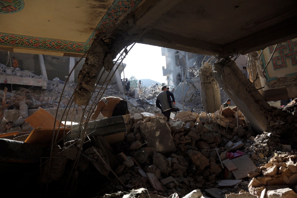 1月18日,在也门首都萨那,人们查看空袭过后的废墟。新华社发(穆罕默德摄)