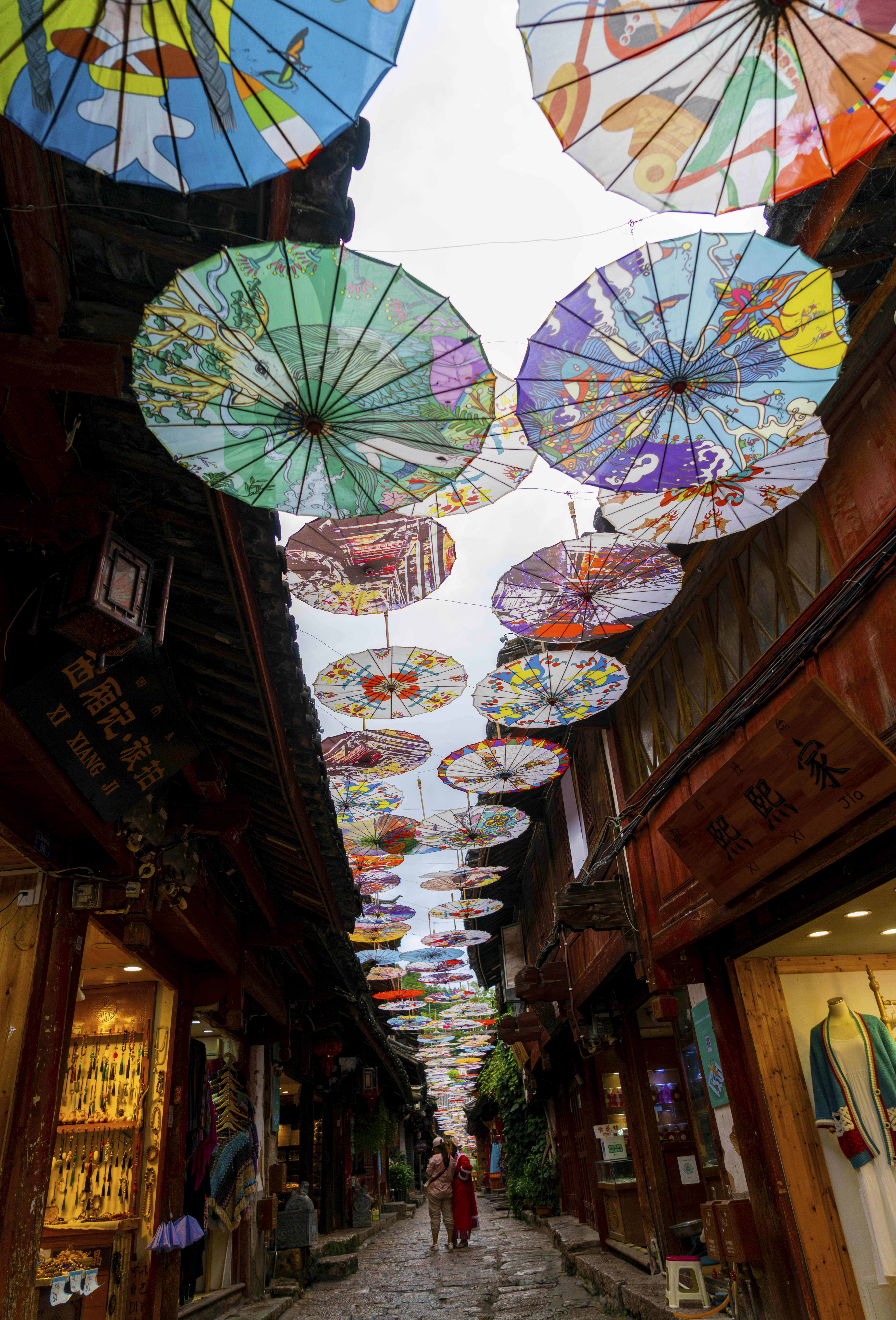 新华社照片,北京,2022年3月22日 活态传承国宝“破圈”——我国文化遗产活化利用观察 这是2021年8月19日拍摄的丽江古城内一条油纸伞装饰的巷子。 (配本社同题文字稿) 新华社记者 陈欣波 摄