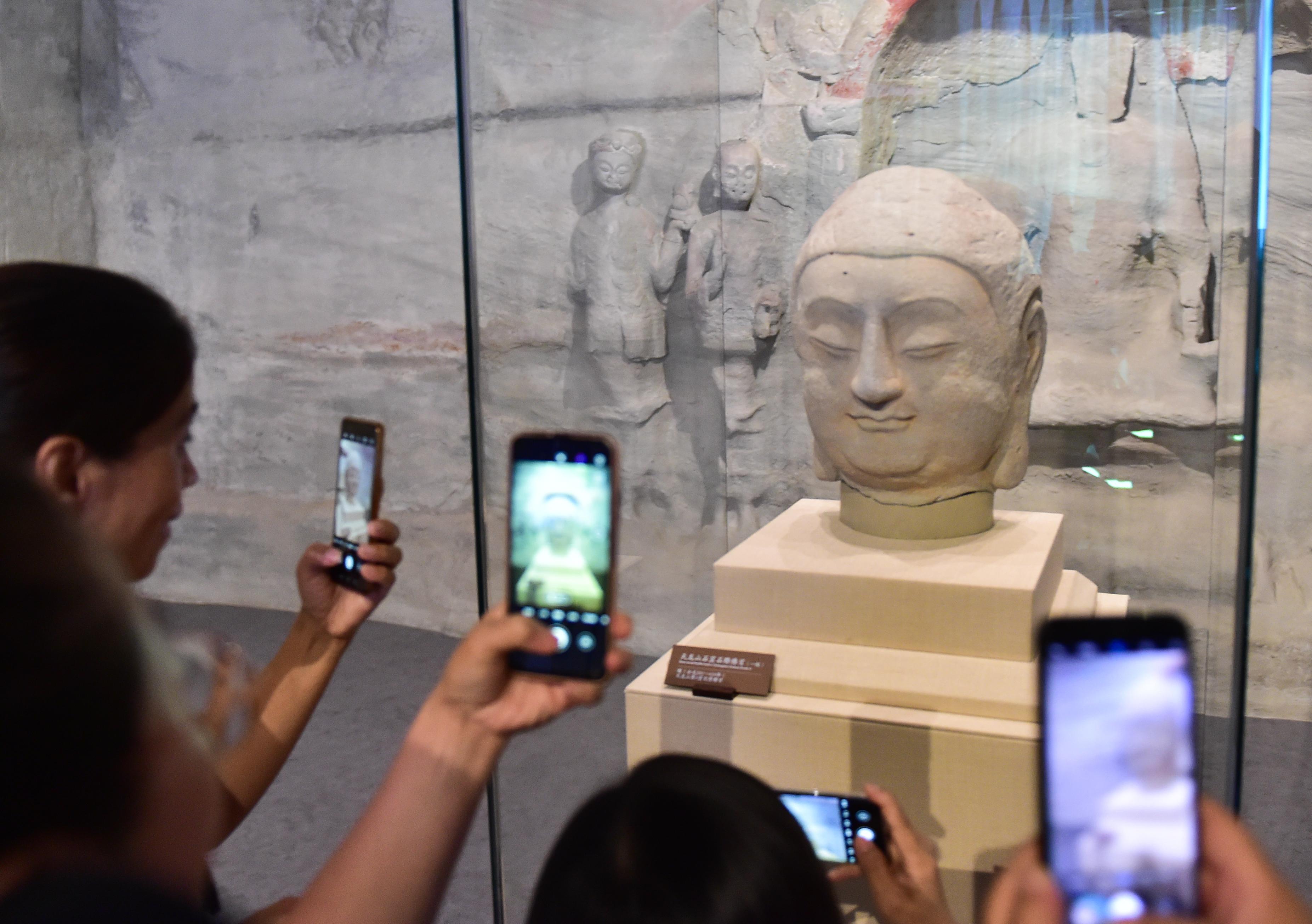 新华社照片,北京,2022年3月22日 活态传承国宝“破圈”——我国文化遗产活化利用观察 在太原市天龙山石窟博物馆,参观者在拍摄回归的天龙山石窟“第8窟北壁主尊佛首”(2021年7月24日摄)。 (配本社同题文字稿) 新华社记者 柴婷 摄