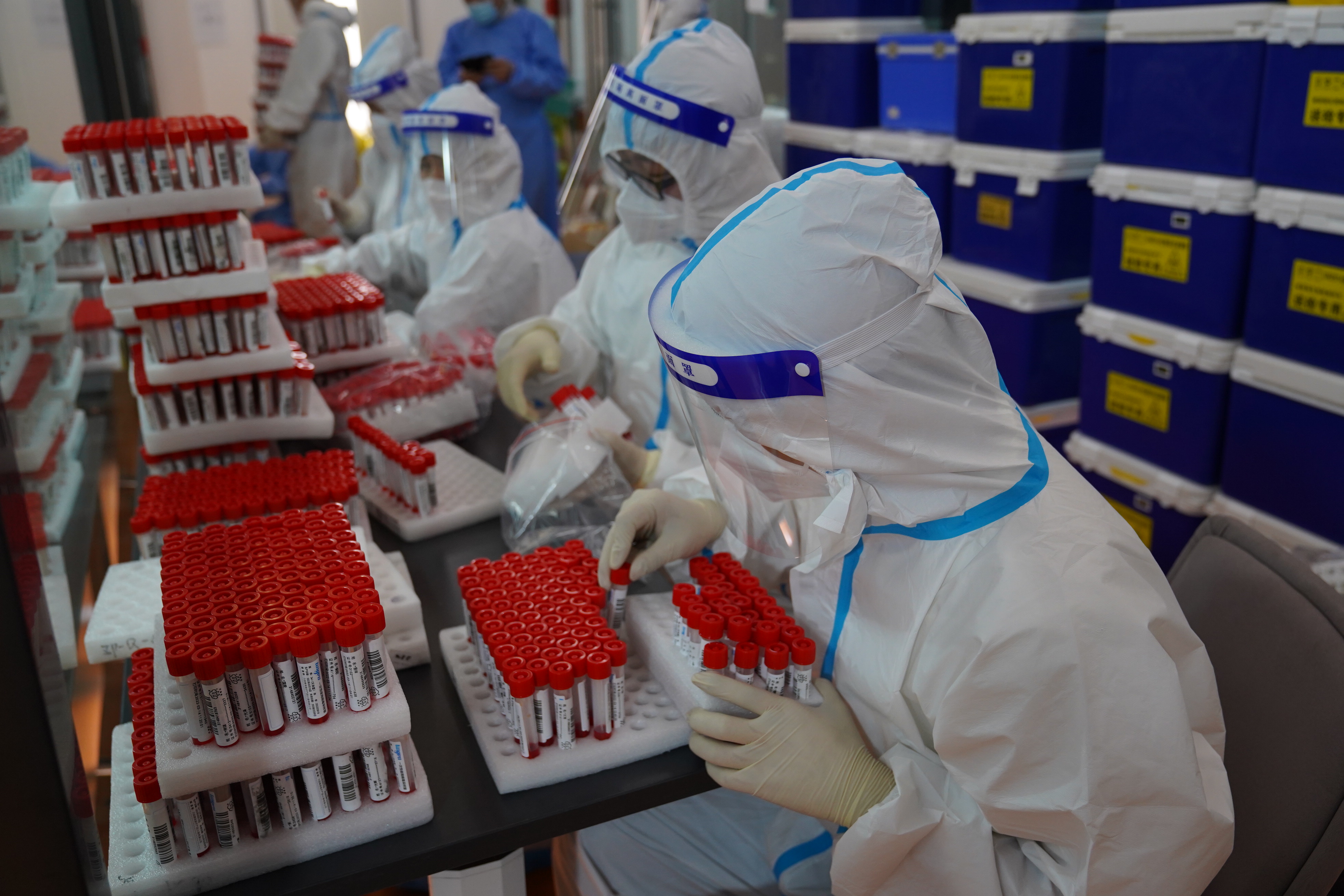 3月15日,志愿者在核酸检测机构整理核酸采样样本。新华社记者 杨有宗 摄