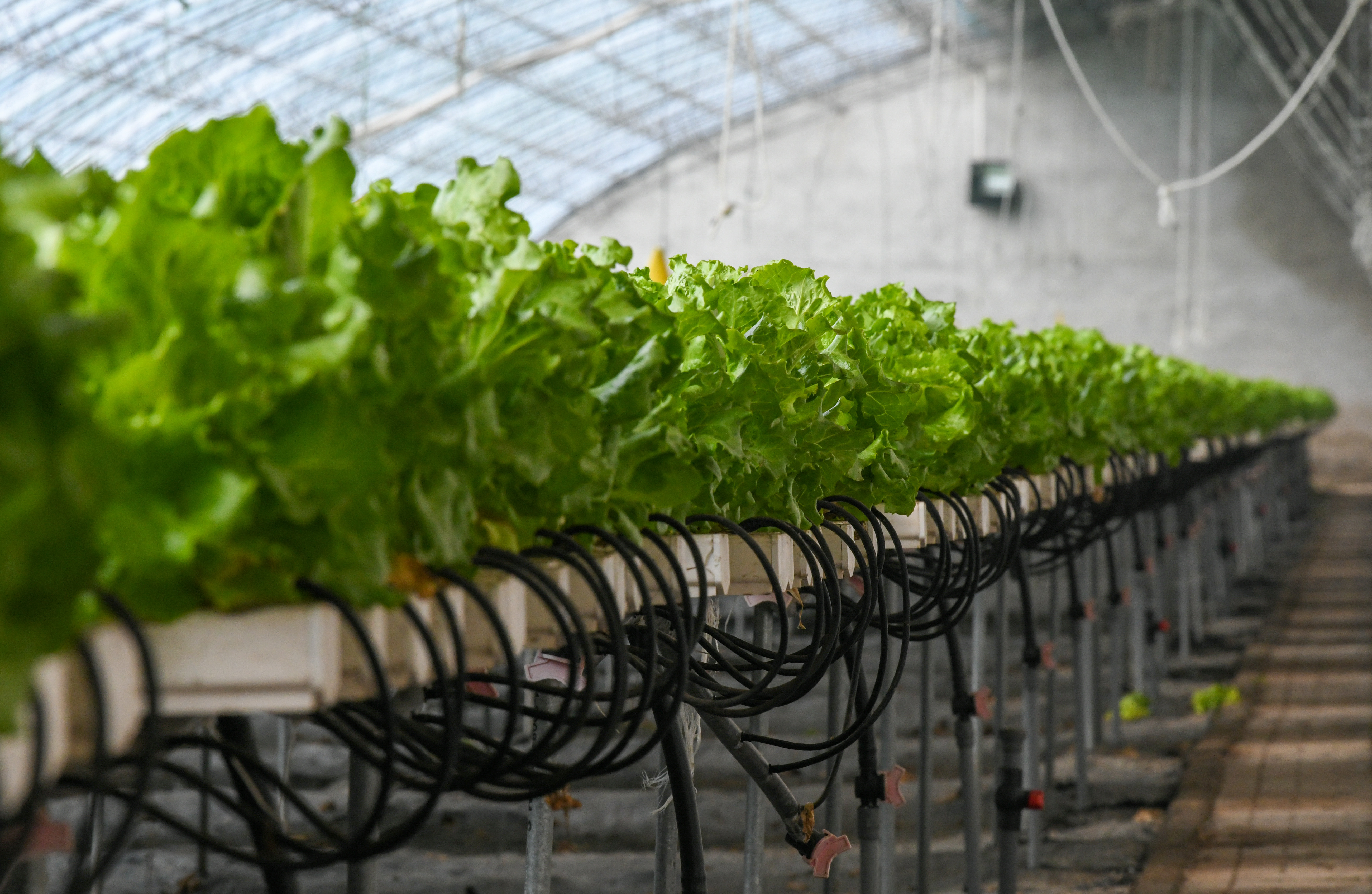 新华社照片,天津,2022年3月22日 把蔬菜种进“水”里 这是3月21日在天津市宁河区百利蔬菜种植基地拍摄的水培蔬菜灌溉用水循环线路。 近日,在天津市宁河区百利蔬菜种植基地,采用无土栽培技术培育的水培生菜长势喜人,一批批的水培蔬菜按照市场订单分批次采摘,保障市场供应。 该种植基地大棚采用带坡度的特制水槽,通过智能化控制可让营养液每15分钟在水培蔬菜根部流动循环一次,余下的水会进行集中过滤,待下一次循环使用。这样生长的水培蔬菜平均30天即可供应市场,一年可以种8到10茬,一亩地年出菜量比土培增加4到6倍。 据了解,该基地有50多个用于水培菜种植的高标准温室大棚,其中的意大利生菜、奶油生菜一年四季均可上市,在满足天津本地需求的同时,还服务周边地区的市场需求。 新华社记者 孙凡越 摄