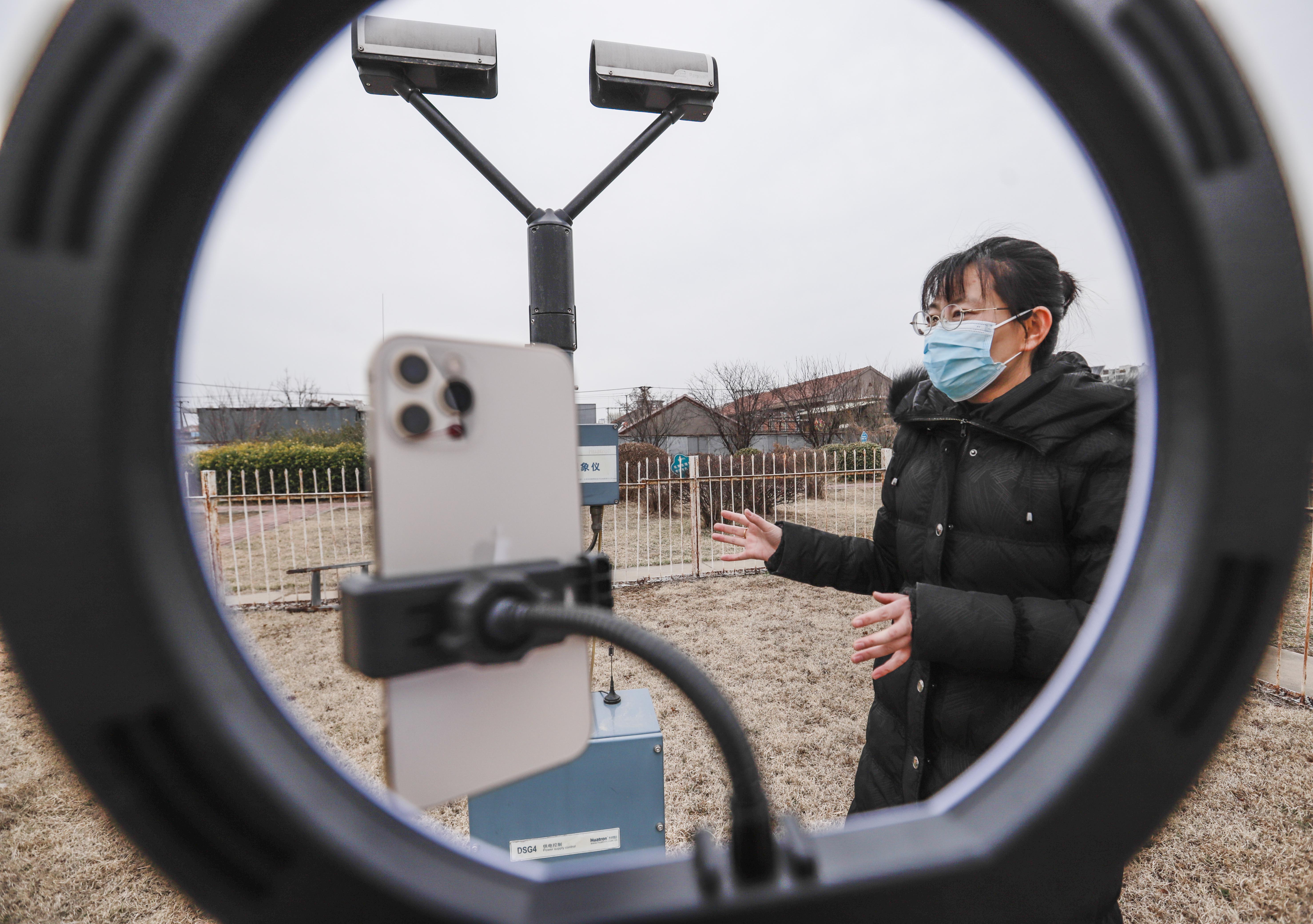 新华社照片,唐山(河北),2022年3月22日 气象日里学气象 3月22日,气象技术人员在河北省遵化市气象局气象观测场,利用直播向人们普及气象知识。 当日是世界气象日,各地开展以气象为主题的科普活动,提高人们对气象的关注和了解,增强环境保护意识。 新华社发(刘满仓 摄)