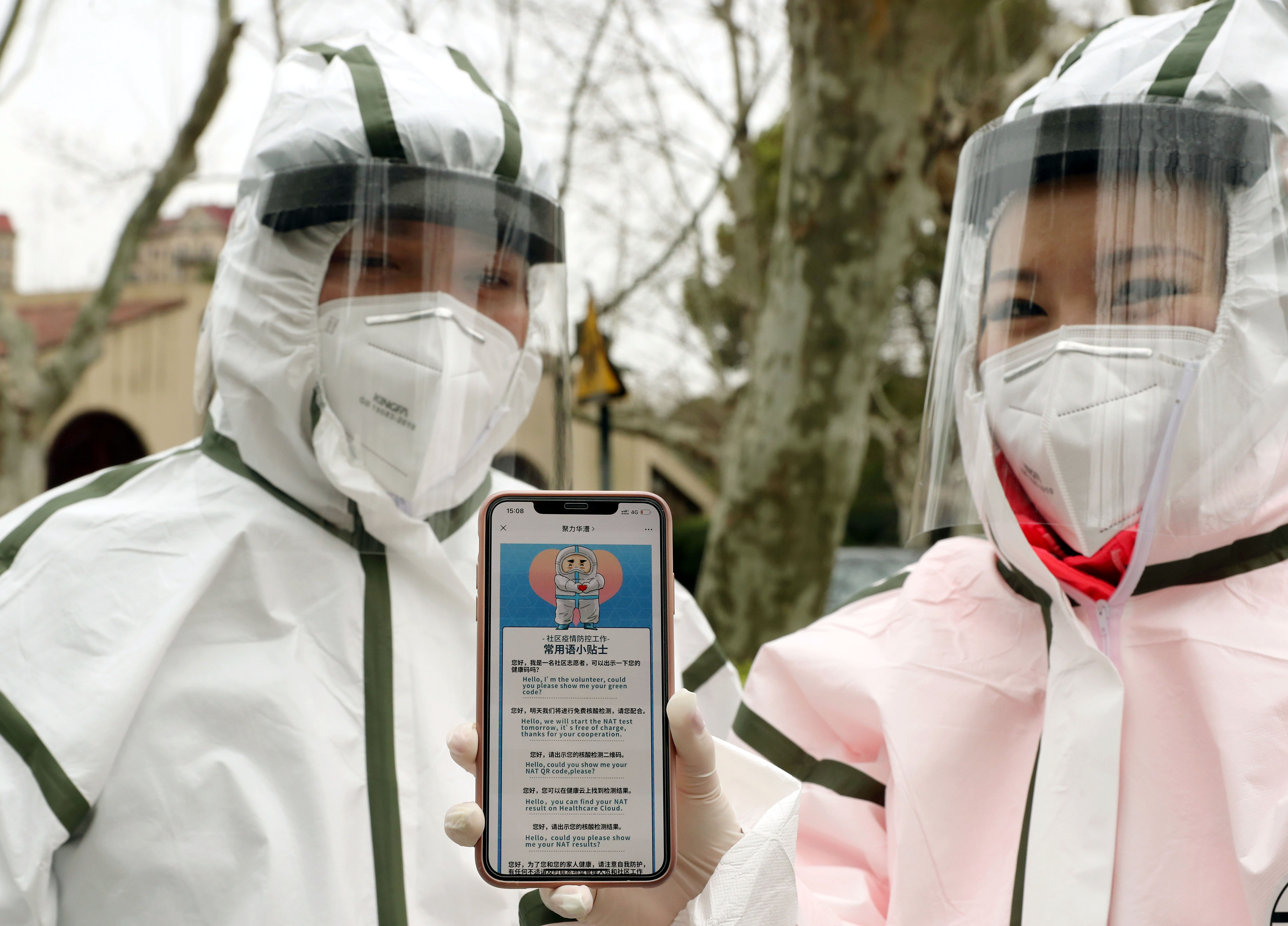 新华社照片,上海,2022年3月22日 夫妻齐心搭起“语言桥” 助力上海国际社区抗疫 3月22日,外语志愿者刘萌子(右)与丈夫张叶展示他们参与制作的国际社区检测现场使用的英文版服务用语。 近日,在上海市闵行区华漕镇国际社区的核酸筛查现场,各个环节都有外语志愿者引导。一对夫妻外语志愿者——张叶与刘萌子已经上岗四天了。夫妻俩擅长英语,沟通能力强,现场引导外籍居民配合采样,与外籍志愿者合作,帮助沟通社区封控期间的事务,在国际社区的抗疫一线无私奉献。 新华社记者 刘颖 摄