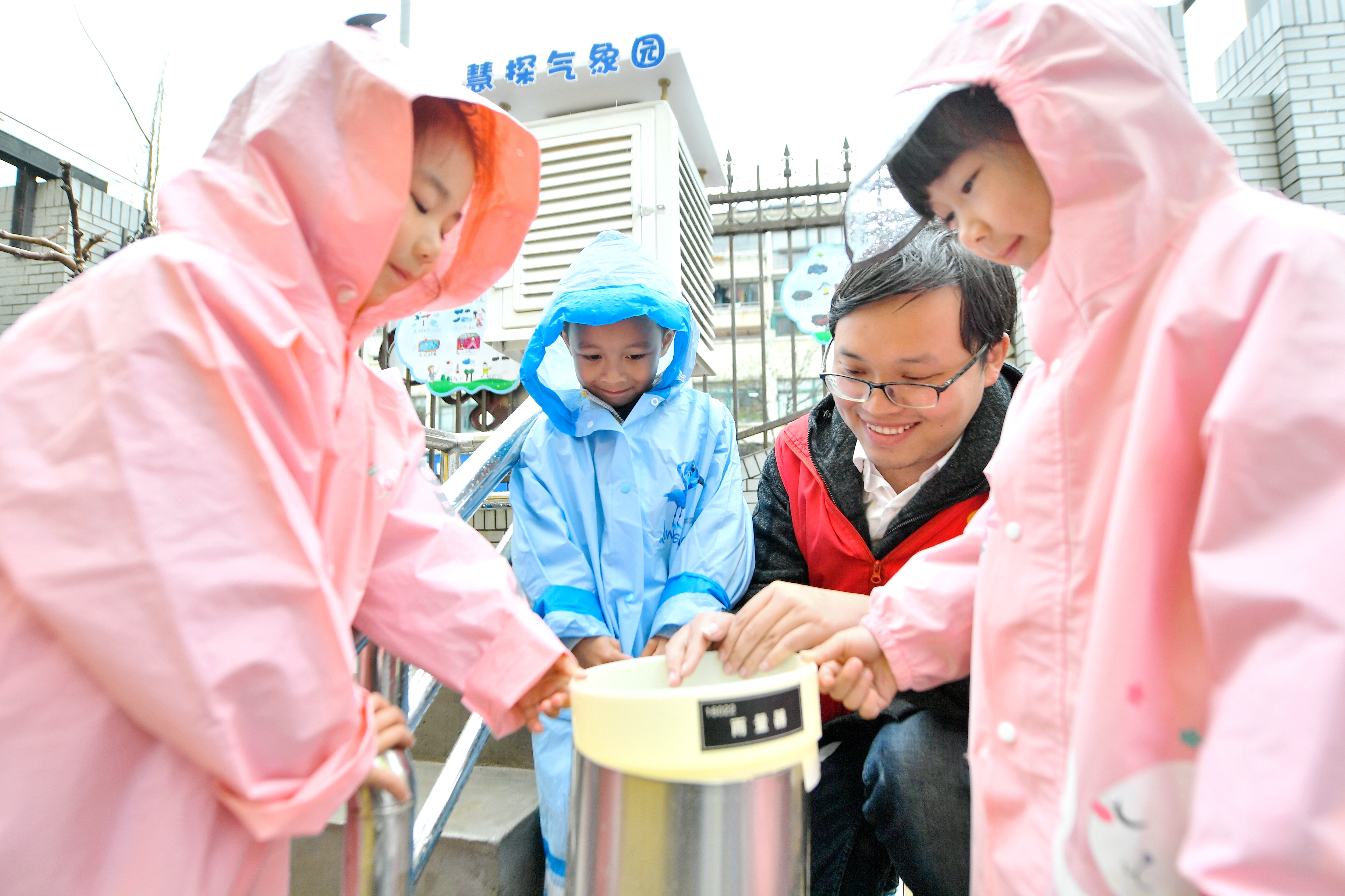新华社照片,长兴(浙江),2022年3月22日 学气象知识 迎接世界气象日 3月22日,在浙江省湖州市长兴县开发区实验幼儿园,孩子们在气象科普志愿者指导下通过雨量筒观测降水量。 世界气象日即将到来,各地开展以气象为主题的科普活动,提高人们对气象的关注和了解,增强环境保护意识。 新华社发(谭云俸 摄)