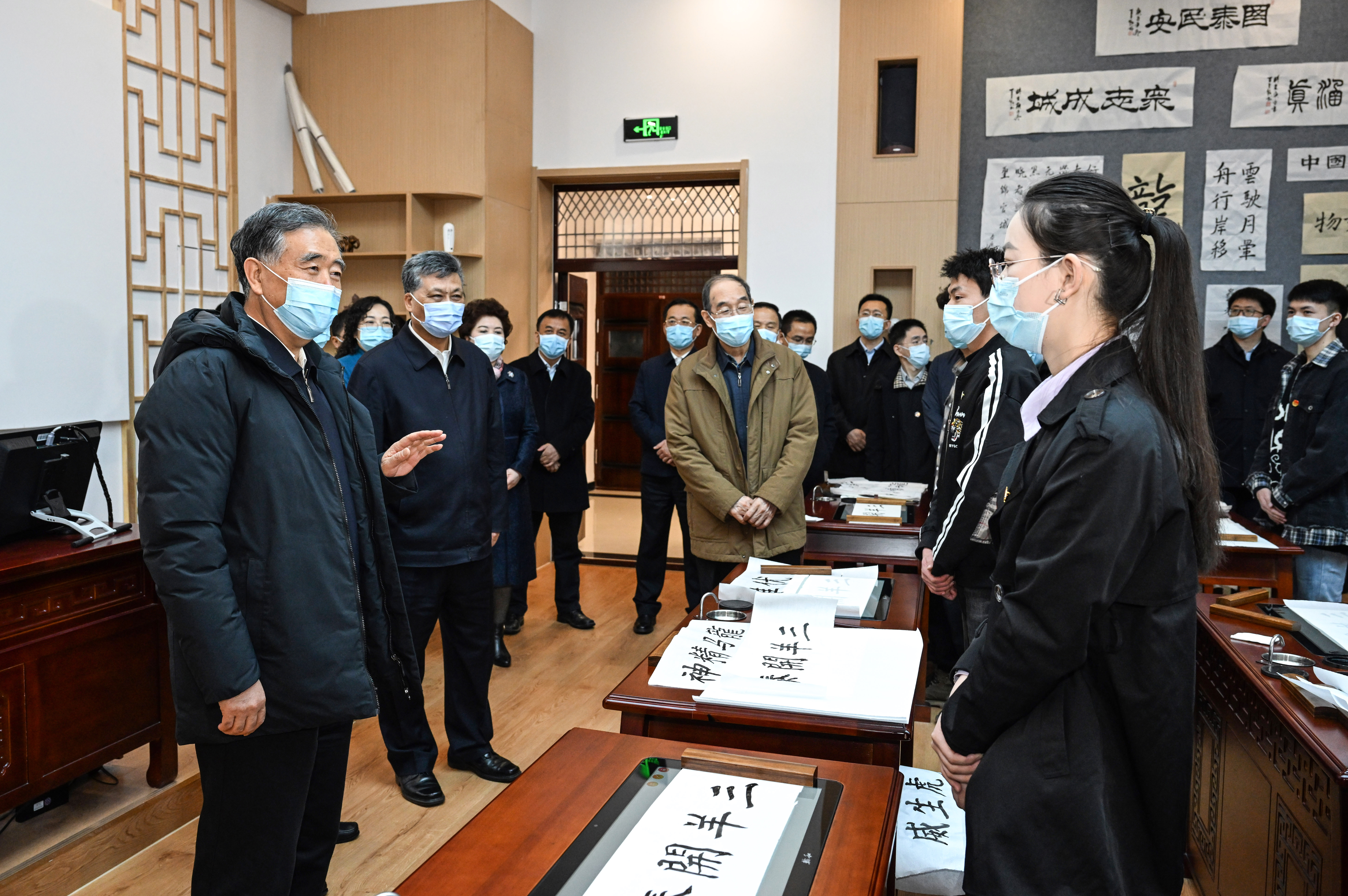新华社照片,北京,2022年3月22日 汪洋在新疆调研 3月18日至22日,中共中央政治局常委、全国政协主席汪洋在新疆调研。这是3月19日,汪洋在新疆师范大学就推动中华民族共同体研究、筑牢中华民族共同体意识进行调研。 新华社记者 饶爱民 摄
