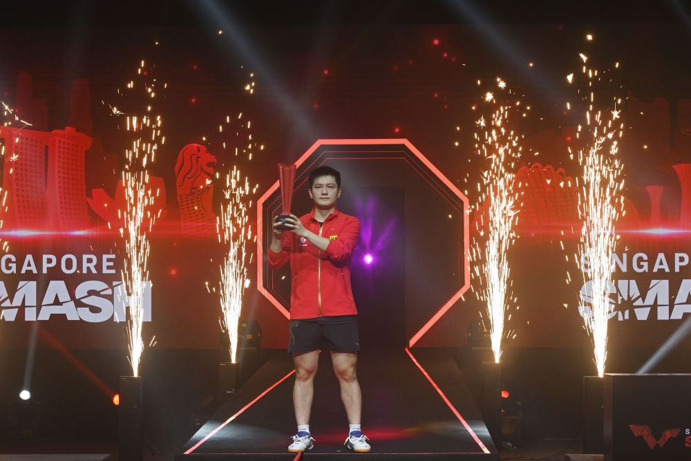 3月20日,在世界乒乓球职业大联盟(WTT)新加坡大满贯男单决赛中,中国选手樊振东夺得冠军。新华社发(邓智炜摄)