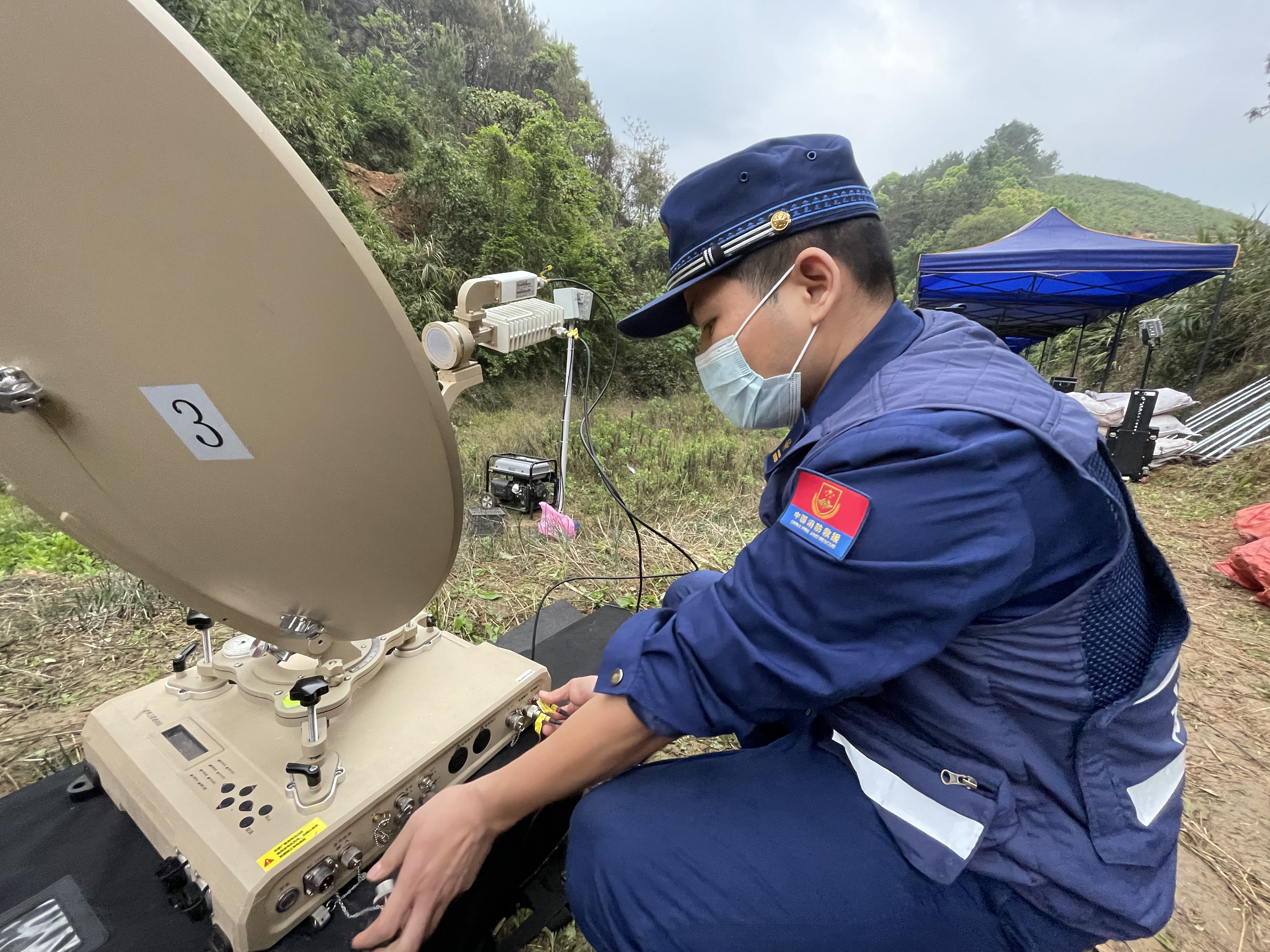 新华社照片,南宁,2022年3月22日 搜寻,与风雨赛跑——藤县空难坠机现场见闻 3月22日,工作人员在东航MU5735客机坠毁事故救援现场架设通信设备(手机照片)。 (配本社同题文字稿) 新华社记者 周华 摄
