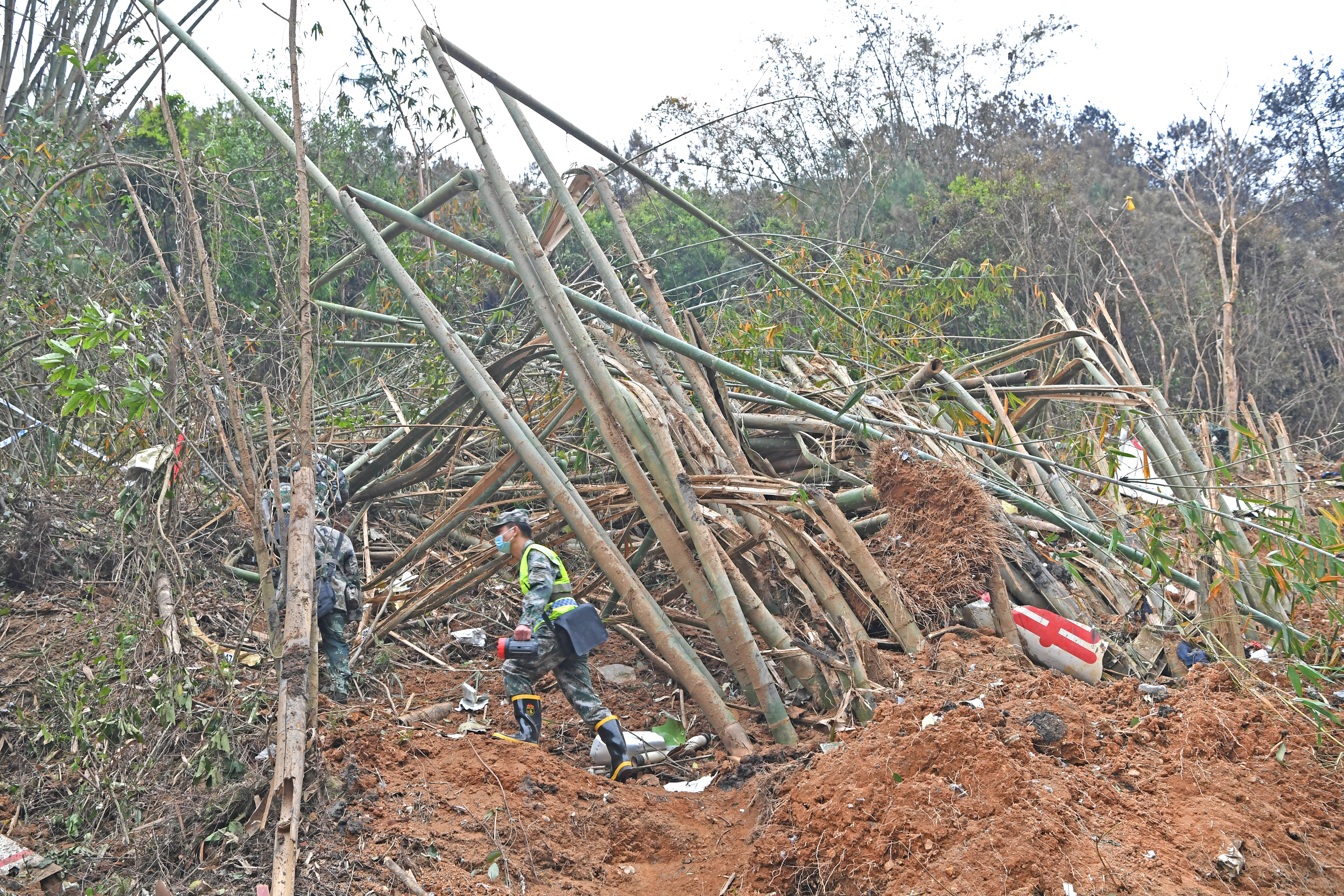 新华社照片,藤县(广西),2022年3月22日 全力搜索黑匣子 3月22日,工作人员在东航MU5735客机坠毁事故现场搜索黑匣子。 3月21日14时38分许,东方航空公司MU5735航班执行昆明-广州任务时,在广西梧州市上空失联并坠毁。机上载有乘客123人、机组人员9人。 新华社记者 周华 摄