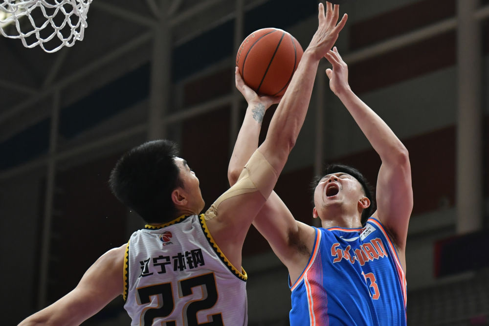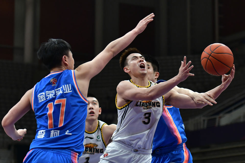 3月22日,四川金荣实业队球员左朕年(右)在和辽宁本钢队的比赛中上篮。新华社记者王乙杰摄