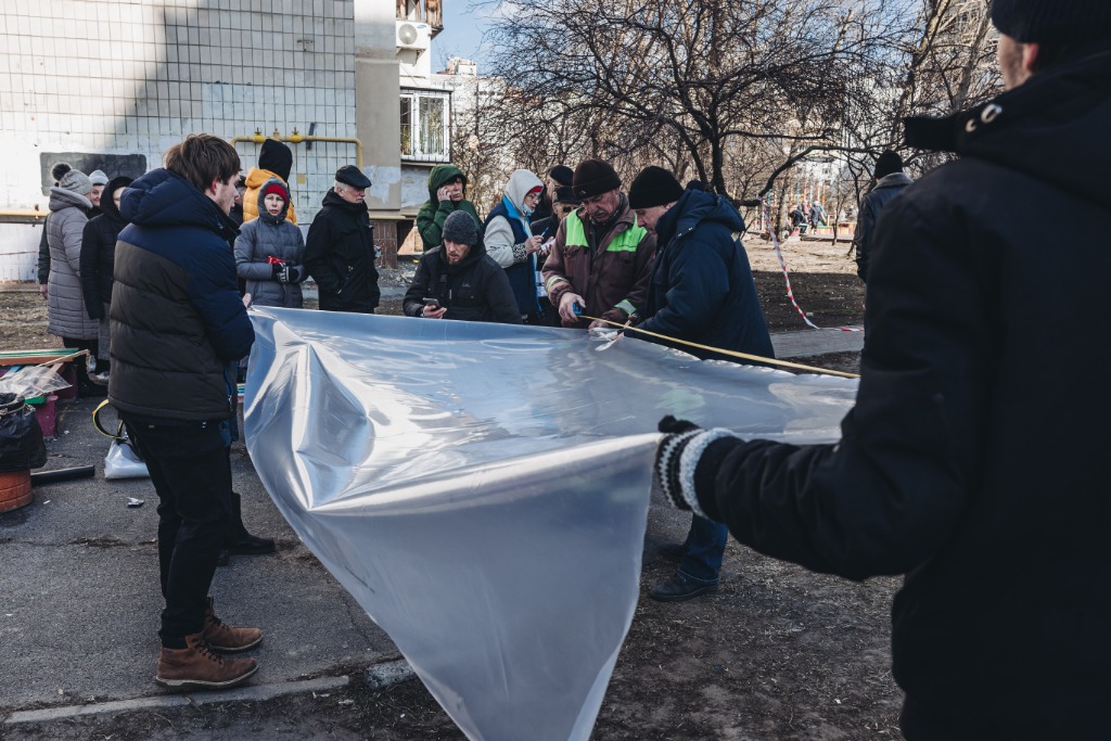 3月17日,人们在乌克兰基辅领取用来遮挡窗户的塑料布。新华社发(迭戈·埃雷拉摄)
