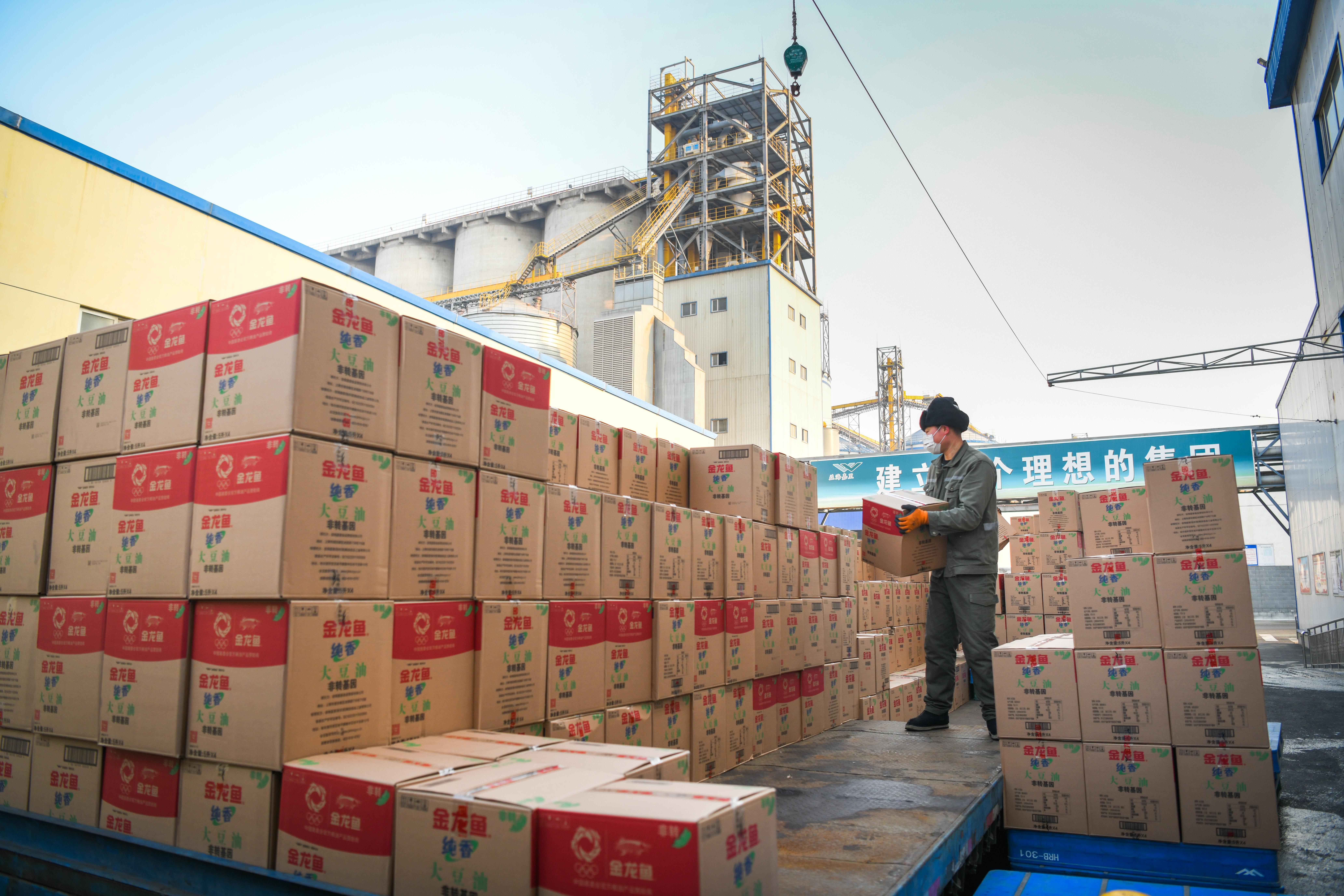 新华社照片,哈尔滨,2022年3月23日 在高水平开放中迈向振兴——外资加大投资东北现象观察 2020年2月20日,在益海嘉里(哈尔滨)粮油食品工业有限公司园区,工人在搬运产品。 (配本社同题文字稿) 新华社记者 王松 摄