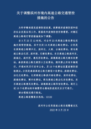 自3月23日12时起,对全市23处高速公路收费站实施交通管控措施,其中关闭13 处高速公路收费站,分别是长深高速公路博兴北、滨州北、大高、古城收费站,荣乌高速公路沾化西、滨州港、无棣收费站,东吕高速公路滨州东、滨城北、滨州西、惠民西收费站,滨德高速公路无棣东收费站,秦滨高速公路无棣西小王收费站,期间禁止所有车辆通行,开通时间另行发布公告。另10个收费站设置疫情防控检测点,分别是秦滨高速公路无棣埕口收费站、滨港收费站、沾化北收费站,长深高速公路滨州南收费站、滨州收费站、滨城收费站、博兴收费站,荣乌高速公路沾化东收费站,东吕高速公路惠民收费站,滨德高速公路阳信收费站,通行上述10个收费站的车辆需符合属地防疫规定后方可通行。