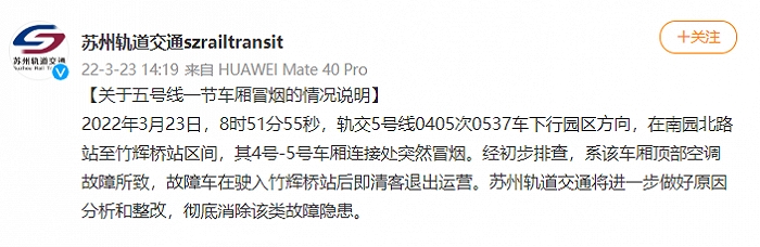 @苏州轨道交通szrailtransit 消息,2022年3月23日,8时51分55秒,轨交5号线0405次0537车下行园区方向,在南园北路站至竹辉桥站区间,其4号-5号车厢连接处突然冒烟。经初步排查,系该车厢顶部空调故障所致,故障车在驶入竹辉桥站后即清客退出运营。苏州轨道交通将进一步做好原因分析和整改,彻底消除该类故障隐患。