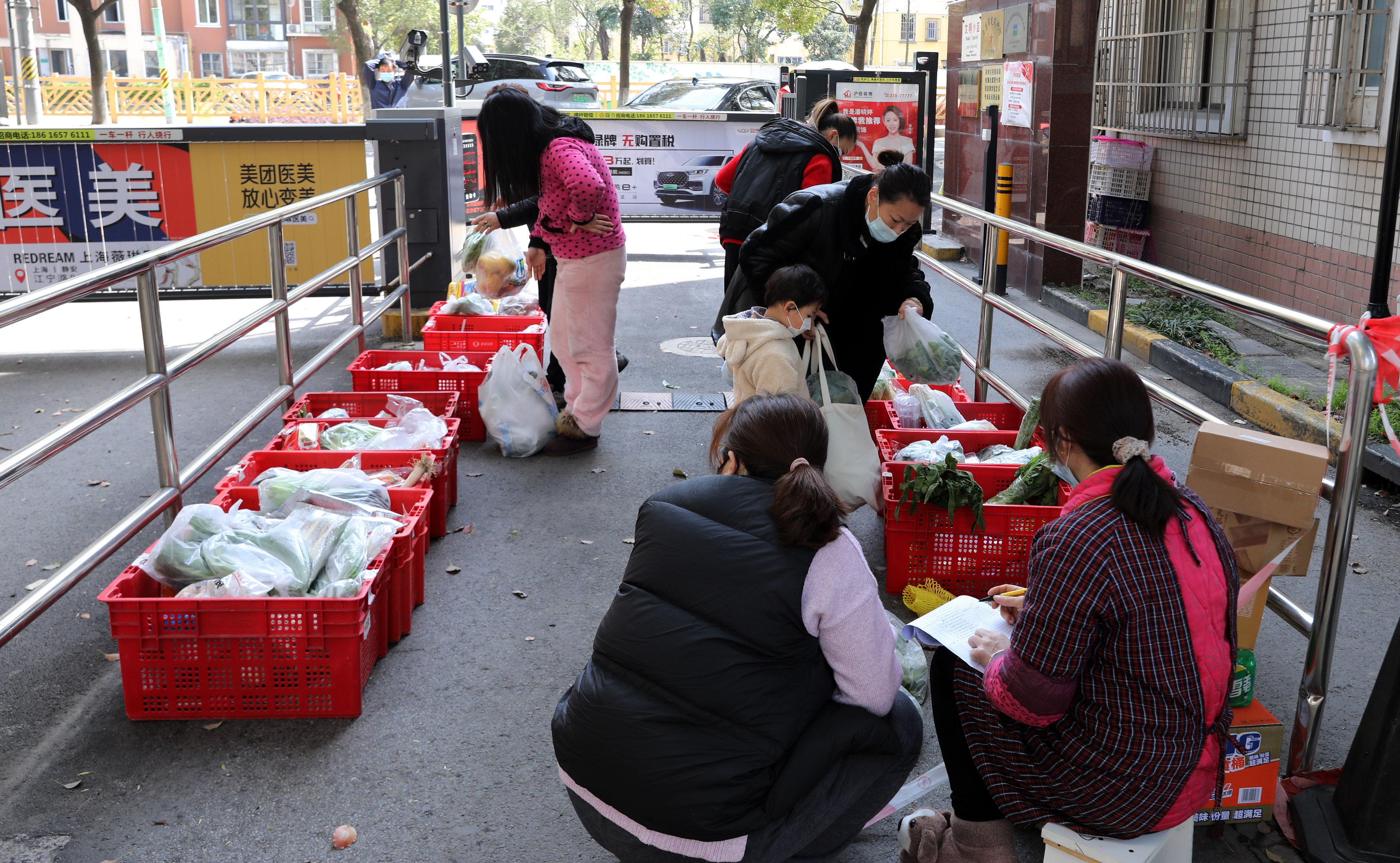 新华社照片,上海,2022年3月23日 上海:封控小区内的居民生活 3月23日,在上海闵行的一个封控小区内,居民选购运进小区的蔬菜。 近日,为配合疫情防控工作顺利进行,上海市部分居民小区实行集中核酸筛查并临时封控管理。 新华社记者 方喆 摄