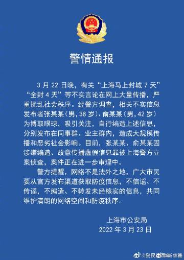 【#上海两男子散布不实言论被立案侦查#】记者23日从上海市公安局获悉,22日晚散布“上海马上封城七天”等不实言论的两名男子已被警方锁定并立案侦查。3月22日晚,有关“上海马上封城7天”“全封4天”等不实言论在网上大量传播,严重扰乱社会秩序。经警方调查,相关不实信息发布者张某某(男,38岁)、俞某某(男,42岁)为博取眼球,吸引关注,自行编造上述信息,分别发布在同事群、业主群内,造成大规模传播和恶劣社会影响。目前,张某某、俞某某因涉嫌编造、故意传播虚假信息罪被上海警方立案侦查,案件正在进一步审理中。(记者朱翃、兰天鸣)